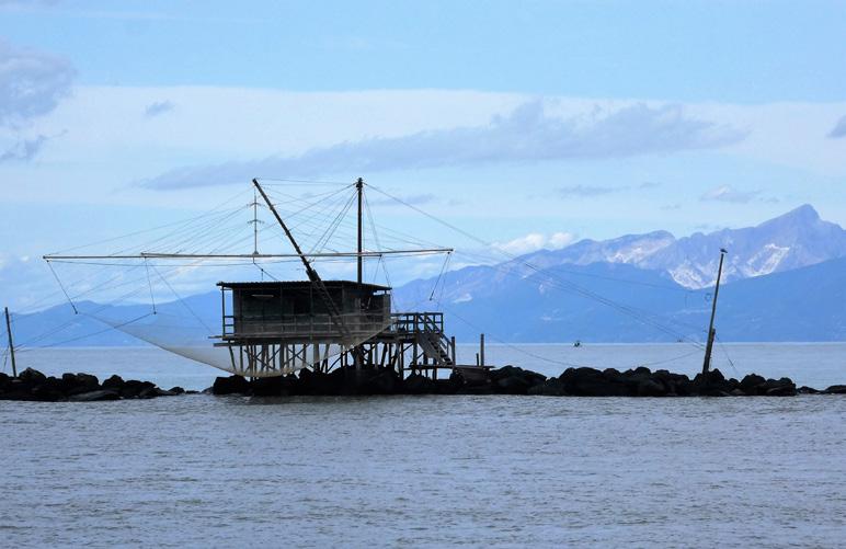 Lido di Pisa, ved Arno-flodens udløb i Middelhavet. Marmorbjergene danner malerisk baggrund.