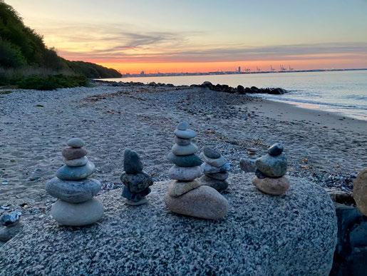 Et flot og stemningsfuldt aftenbillede fra DCU-Camping Aarhus – Blommehaven, solnedgang over Aarhus med kunsteriske stenskulpturer i mini udgave. Ellen Rasmussen, Egtved