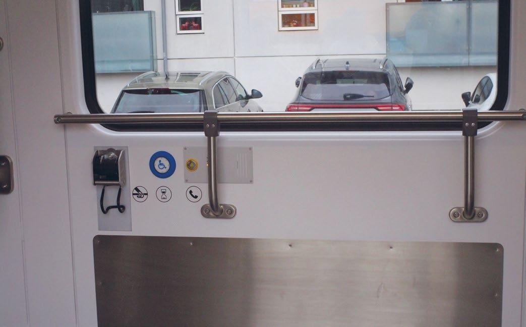 Kørestolspladserne er tydeligt markerede, og der er en vandret stang plus to lodrette bøjler til at holde i ved kørestolspladserne for de passagerer, der har brug for det. Det er ikke muligt at få fastspændt kørestolen. Selve togturen er trods accelerationen behagelig. Vi står først af på Glostrup Station og mærker endnu en gang det høje trin, som får kørestolene til at bumpe hårdt ned i perronen.