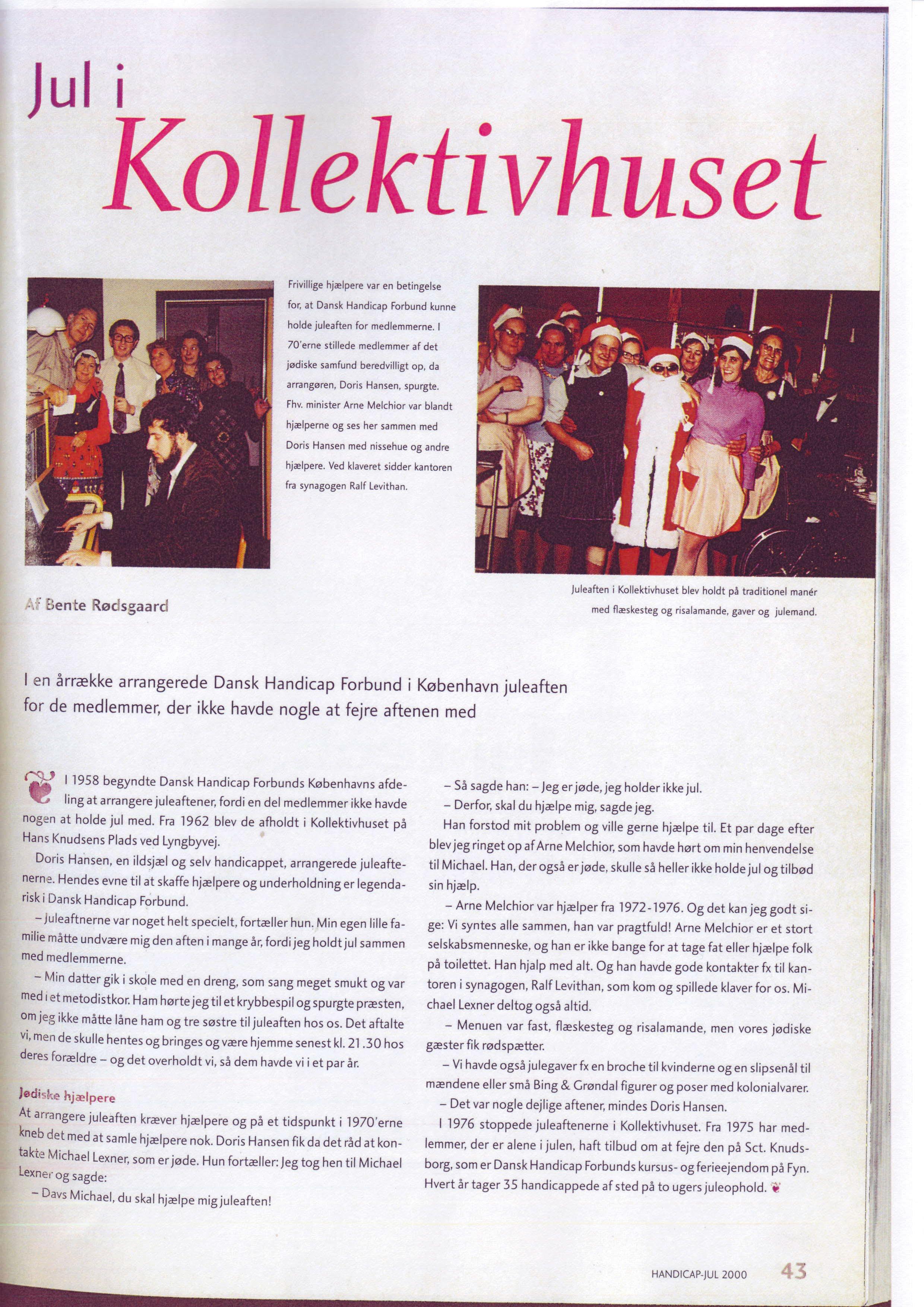 ”På et tidspunkt i 1970erne, var vi ikke særlig mange til at hjælpe, så var der en direktør i Skandinavisk Rejsebureau, som sagde til mig, at jeg skulle kontakte Michael Lexner, som var jøde. Så tog jeg hen til ham og sagde: Davs Michael, du skal hjælpe mig juleaften! Så sagde han: ”Jeg er jøde, og jeg holder ikke jul.” Derfor, skal du hjælpe mig, sagde jeg.Han kunne godt forstå mit problem. Et par dage efter blev jeg ringet op af Arne Melchior, som havde hørt fra Michael, at jeg manglede hjælp. Han ville også gerne hjælpe. Det gjorde han så fra 1972-1976. Og det kan jeg godt sige: Vi syntes alle sammen, han var pragtfuld! Arne Melchior er et stort selskabsmenneske, han er ikke bange for at tage fat eller hjælpe folk på toilettet. Han hjalp med alt. Og han havde mange gode kontakter fx til kantoren i synagogen Ralf Levithan, som kom og spillede klaver for os. Michael Lexner deltog også altid. En enkelt gang havde Arne Melchior nogle kusiner med, som også hjalp til. De var alle sammen utroligt dejlige mennesker.”