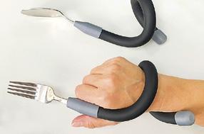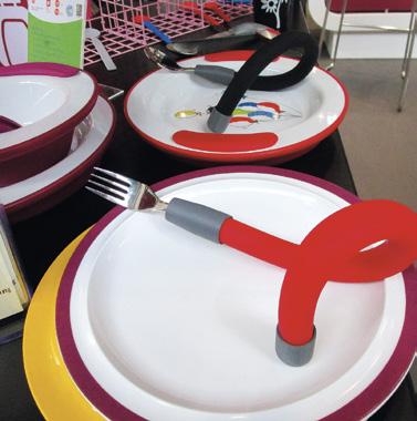 I en reol på standen var der også små hjælpemidler fx spiseredskaber, som har lange bøjelige greb til at slynge om armene, så hænderne bedre kan holde på bestikket, så man ikke taber det. Der var også drikkeanordninger til flasker, så barnet kan lære at drikke uden at skade sine tænder, da der er et indbygget læbestop og et korrekt placeret sugerør.