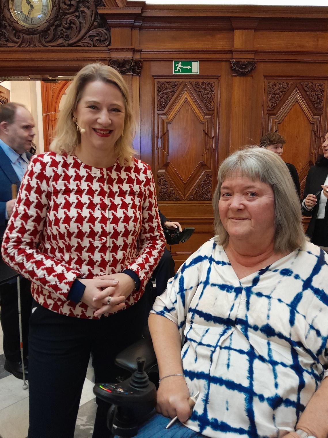 Landsformand Susanne Olsen benyttede den internationale handicapdag til at fortælle social- og boligminister Sophie Hæstorp Andersen om de politiske visioner, som forbundet har formuleret i løbet af jubilæumsåret. (Foto: Jeppe Kerckhoffs)