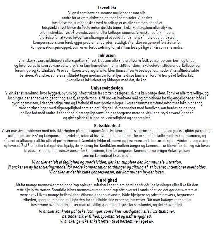 Vi ønsker befolkningens forståelse for, at vores levevilkår afhænger af et solidt fundament af individuelt tilpasset kompensation, som forebygger problemer og ydes rettidigt. Vi ønsker en generel forståelse for kompensationsprincippet, som er en forudsætning for, at vi kan leve på lige vilkår som alle andre.