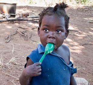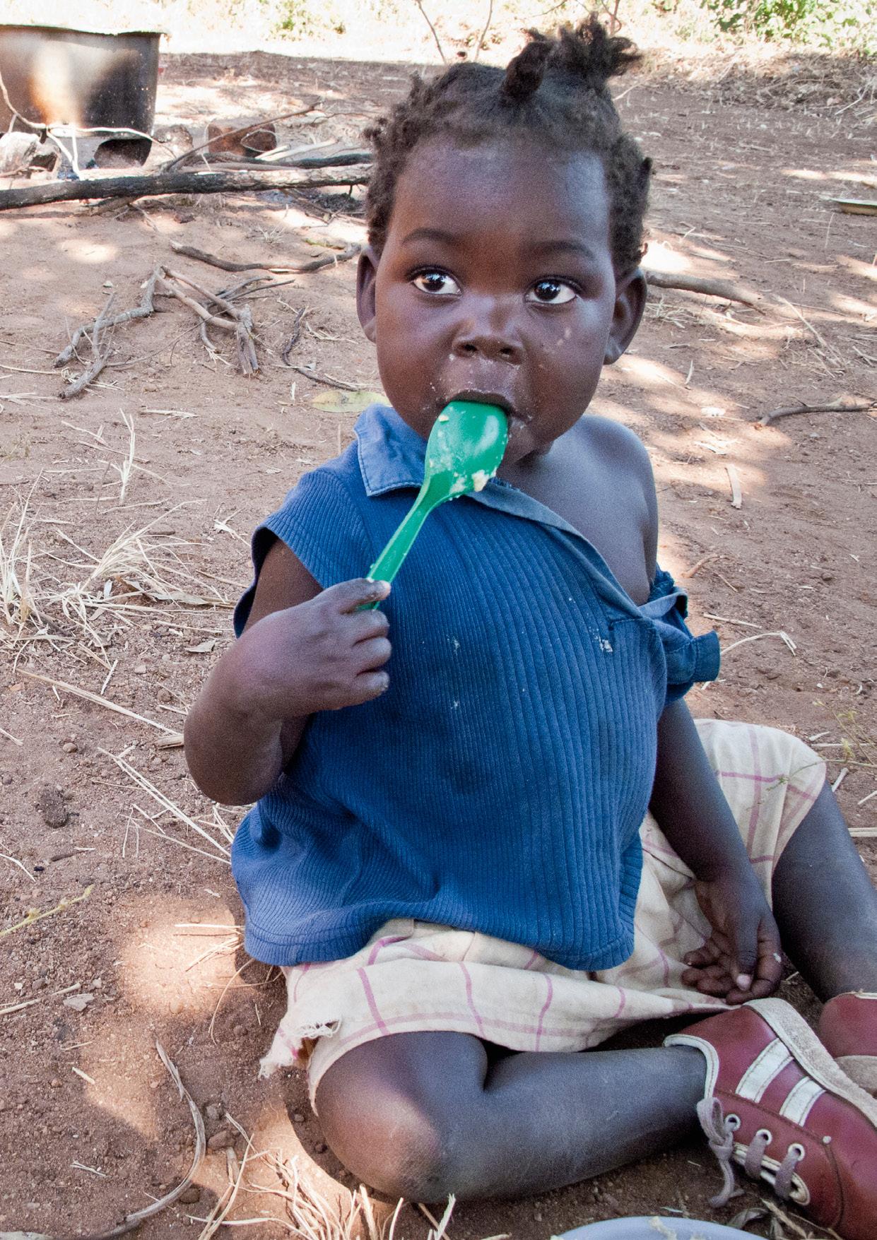 Sungeni Saizi er med sine to år lidt yngre end resten af børnene på centeret i Namithethe. Men hun klarer det helt fint selv at spise majsgrøden, som de frivillige har lavet.