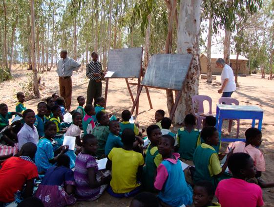 Her er vi på besøg i en skole, hvor undervisningen foregik udendørs i skyggen af de store træer. På skolen var der ca. 1500 elever og ti lærere. 91 af eleverne havde mistet en eller begge forældre.