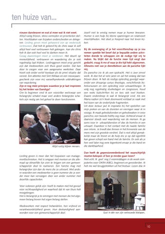 Jezelf niet te ernstig nemen maar je humor bewaren. Humor is een hulp bij kleine spanningen en relativeert moeilijkheden. Het doet je hoopvol naar het leven kijken. Bij de overweging of je het voorzitterschap op je zou nemen speelde het besef dat je bepaalde andere activiteiten diende te schrappen om de nodige tijd vrij te maken. Nu blijkt dat de functie meer tijd vergt dan gedacht, vraag ik me af waar je die tijd hebt afgenomen. Alleszins niet van je dienstbetoon aan de parochie lijkt mij. De parochie zie ik als een opdracht. Het is zeer zinvol werk. Ik doe het al vele jaren en zal het zolang dat kan blijven doen. Ik heb de nodige opleiding gevolgd waaronder een driejarige cursus theologie, verschillende bijbelcursussen en een opleiding voor uitvaartliturgie. Ik volg nog regelmatig studiedagen en congressen, houd een reeks tijdschriften bij en lees ook veel boeken. Daarin onderstreep ik wat ik belangrijk vind. Als ons Maria nadien zo’n boek doorneemt volstaat ze vaak met het lezen van de onderlijnde fragmenten. Uit deze lectuur put ik inspiratie bij het opstellen van mijn preken en van de diensten en vieringen waar ik in voorga. Ik maak gebedsdiensten en gebedswaken in onze parochie, een tweede hobby zeg maar. Achteraf ervaar ik daarvoor steeds veel waardering van de mensen. Ik ga soms voor in uitvaartdiensten of doe de homilie in een uitvaart. Daardoor is het contact met de naaste familie zeer intens. Je treedt dan binnen in het binnenste van de mens met zijn grootste verdriet. Dat is niet altijd gemakkelijk maar de troost en de hulp die je op dat ogenblik kan geven schept een band met de familie. En ook als je hen veel later nog eens tegenkomt ervaar je die band en die dankbaarheid. Dan heeft de gepensioneerdenbond het waarschijnlijk moeten bekopen of ben je minder gaan lezen? Niet echt. Ik geef nog 2 voormiddagen in de week computerles voor OKRA (KBG), beginners en gevorderden. Ik heb me wel teruggetrokken uit het bestuur. Lezen doe ik