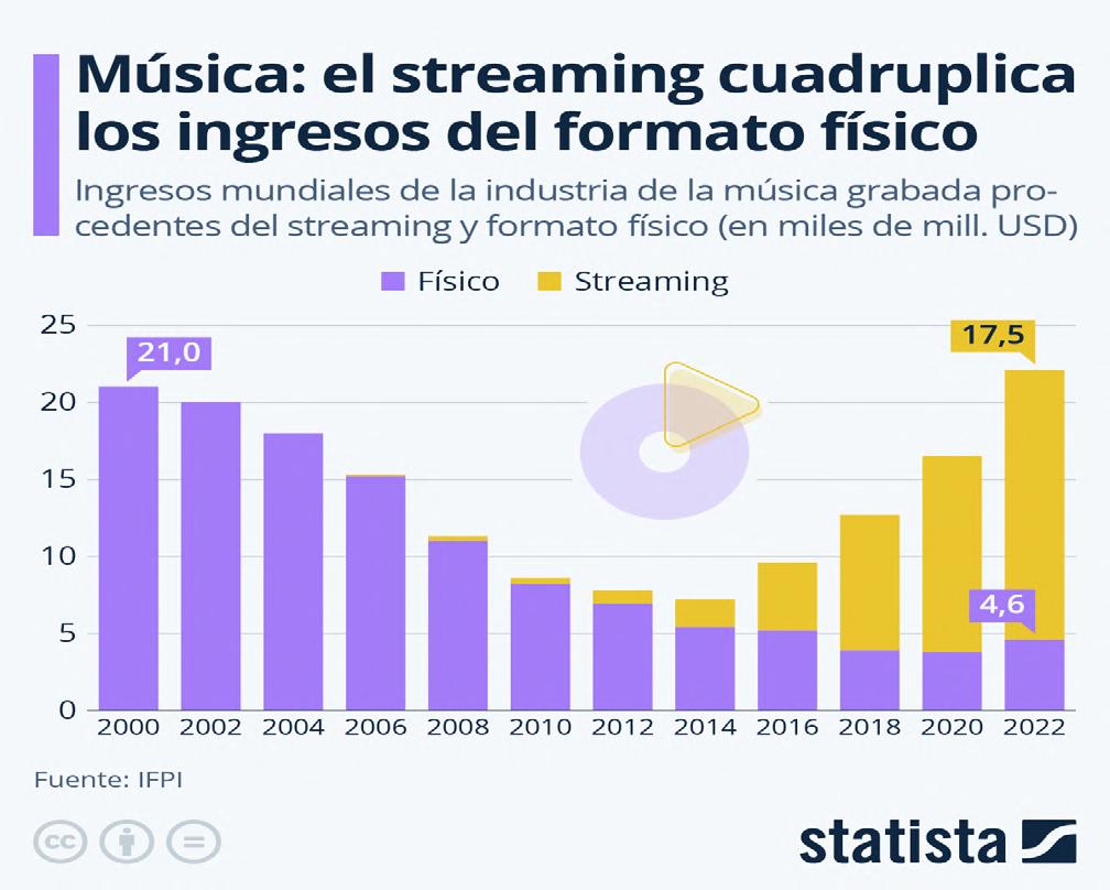 Hace 20 años, la industria mundial de la música grabada ganaba dinero con soportes físicos, pues Spotify y las demás plataformas aún no estaban a la vista. En la actualidad, esta industria factura unas cuatro veces más con el streaming que con los CDs, vinilos o casetes. Las plataformas de streaming son, por tanto, responsables en gran medida de que la industria vuelva a crecer, tal y como muestra