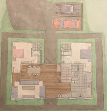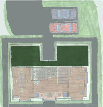 My project is the Farnsworth Guest House this space is occupied by two architects on the north side of Illinois. The vision that I imagined for this guest house was two people would live together but never interact with each other. This is a two-story house with bedrooms and office spaces with a quiet area to relax. In the backyard, I added a green roof for both of the houses so they can enjoy the view and invite people they know with crossing paths with each other.