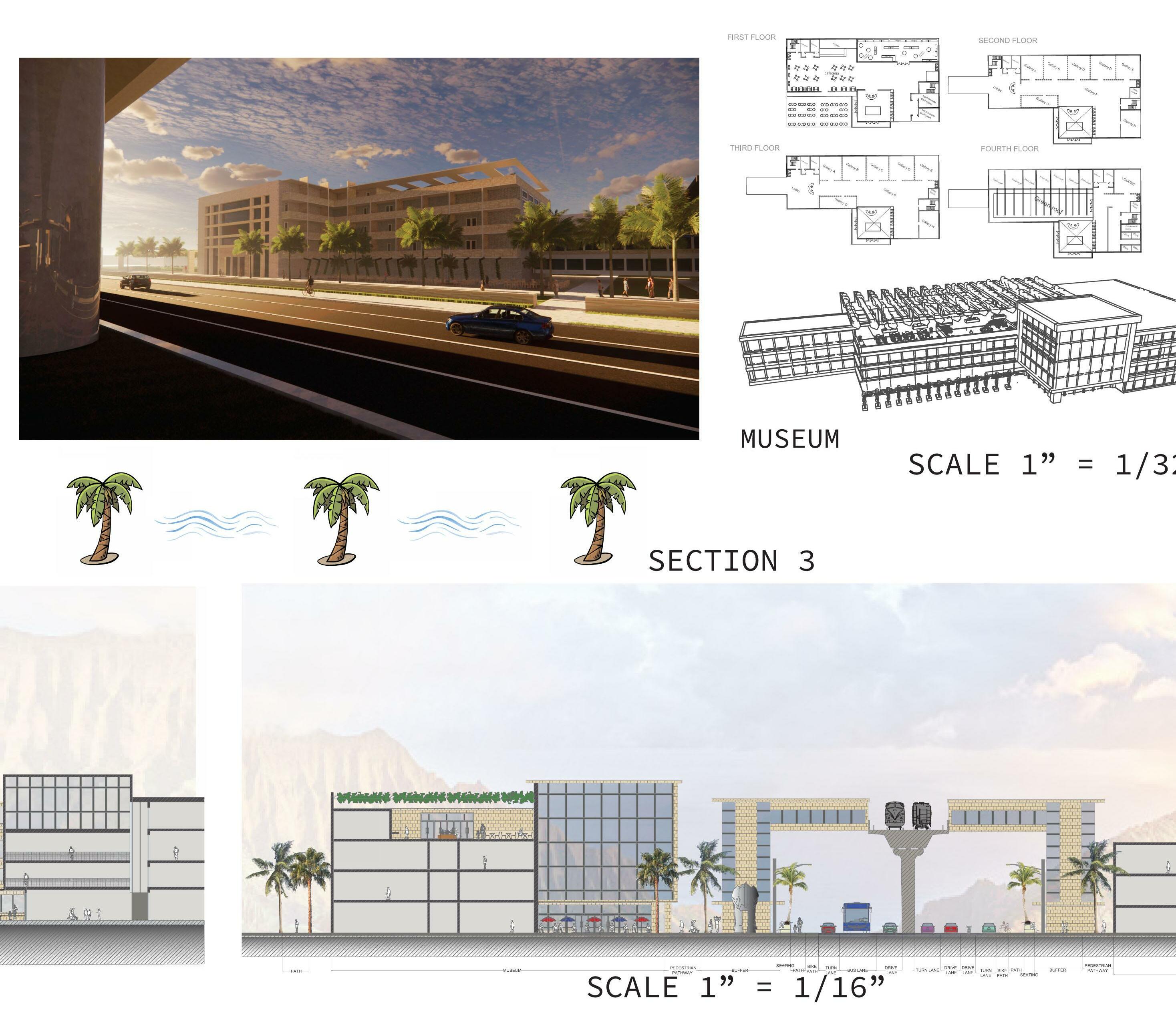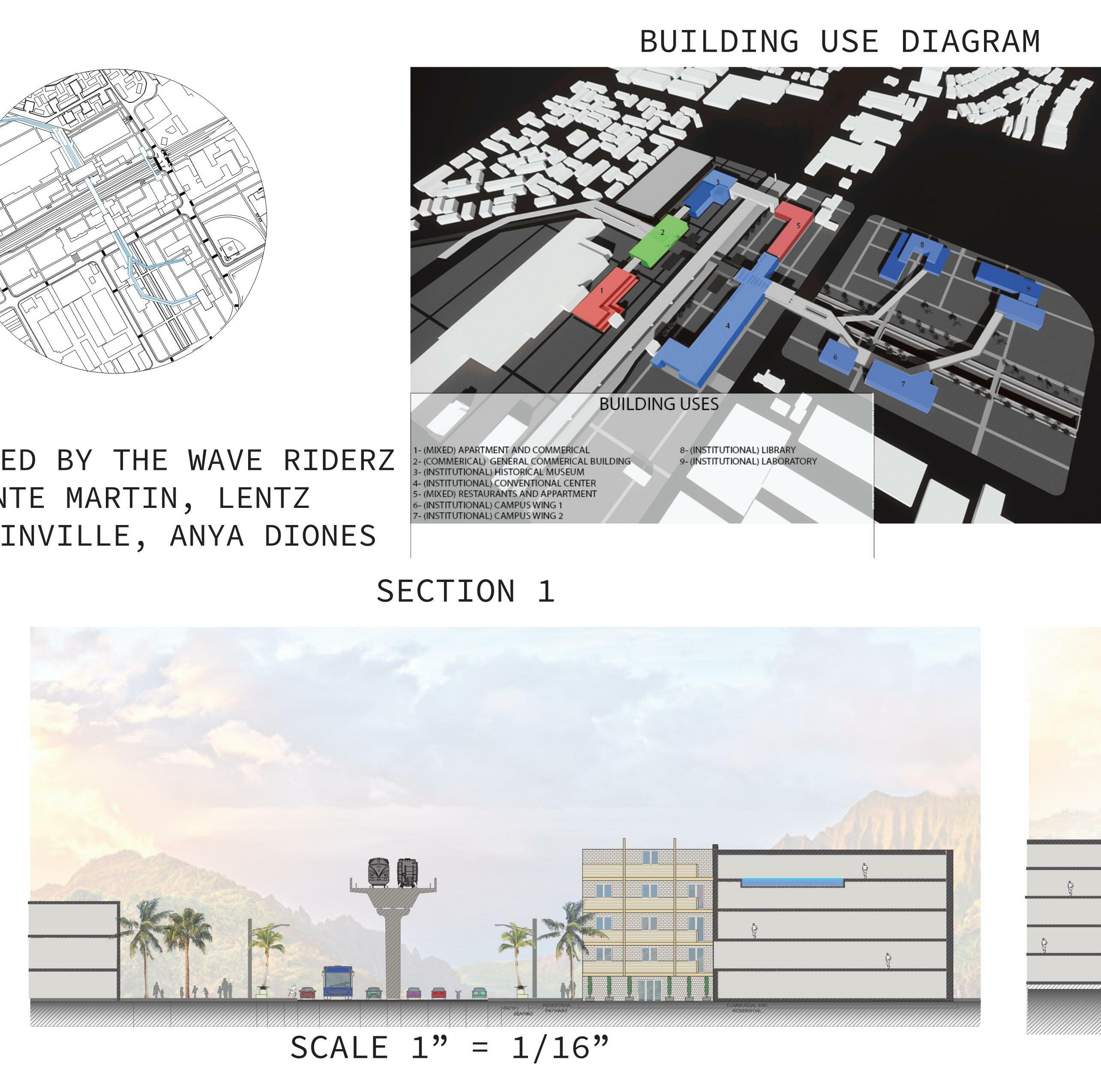 I and my group members are also known as the wave riders. Our design process was to find a location where people gather and socialize in Hawaii. we designed three programs the one on the left is a hotel with commer cial use on the bottom. The building in the middle is a mixed commercial building with a restaurant on the top is also a bridge connection that con nects through the building stretching along the site. Now the last building on the right is a mix use building with a museum and a restaurant on the bottom floor.