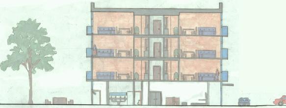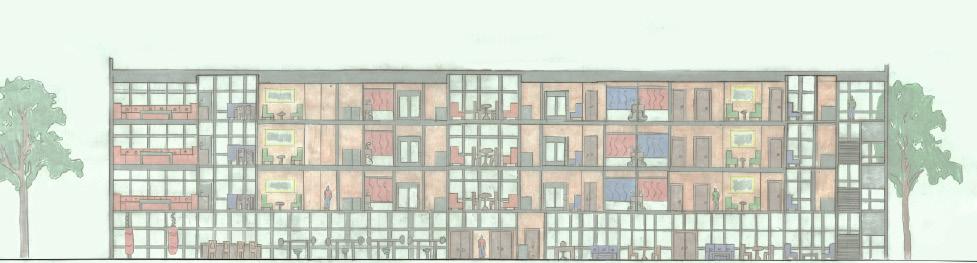 My Multi-family Complex has 4 floors, the ground floor is commercial which holds a public gym on the left side of the building and a Starbucks cafe on the right also public, and a lobby state in the middle connecting the two programs. While the remaining three floors on top are an apart ment building that holds a few bedroom apartments, a couple of two-bedroom apartments, and some studio apartments that are private only to the guest.