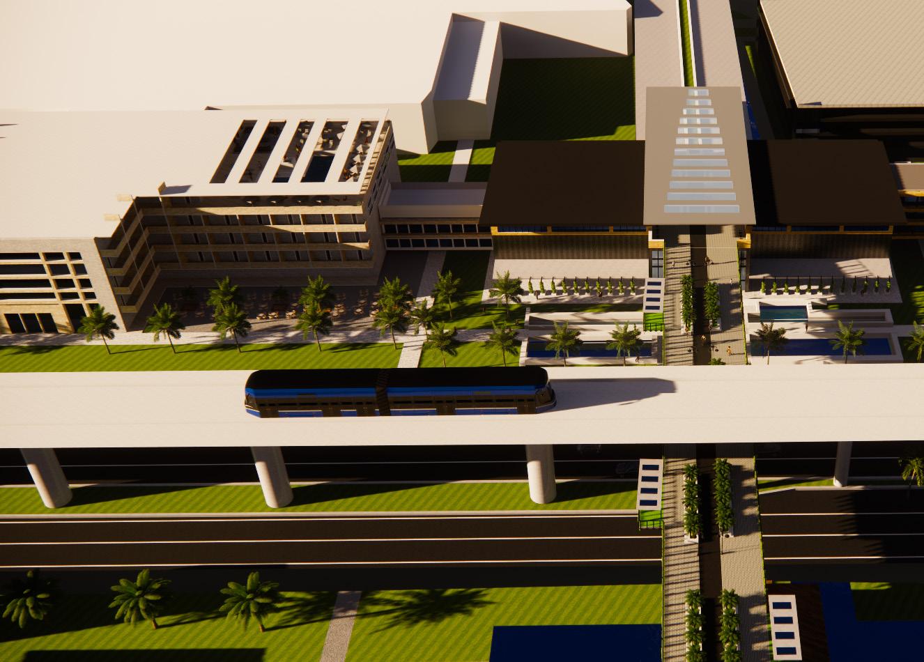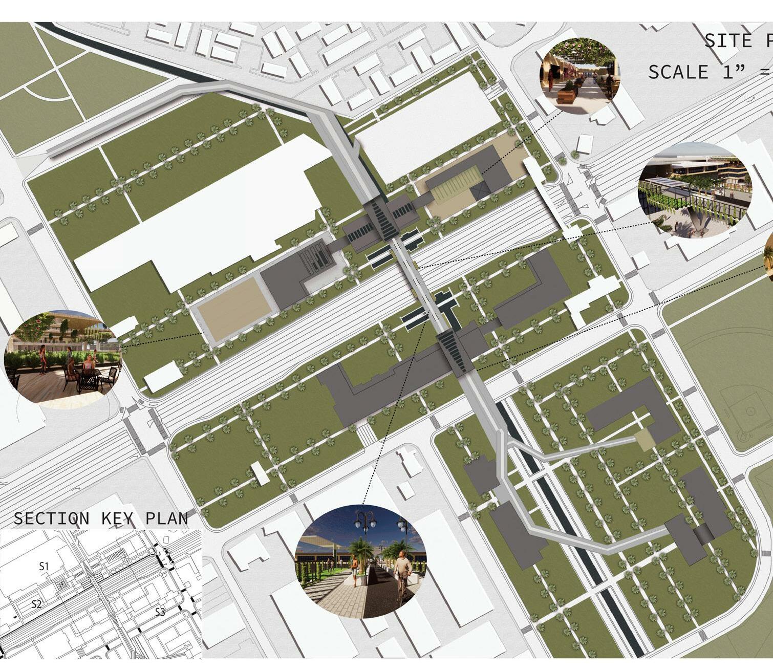 We wanted to keep some of the ex isting sites so we kept the train we designed a whole new train station where the train stops so people can hop off and visit the site. The bridge was used to oversee the high way so people can travel safely without crossing the highway.