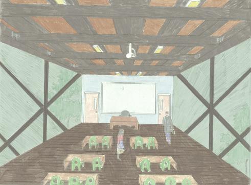 The classroom has metal wired mesh around it so no bugs or animals can come in and disrupt what going on inside. Also, the metal has a heat insulator that if the sun hits will collect the heat and release them to the class
