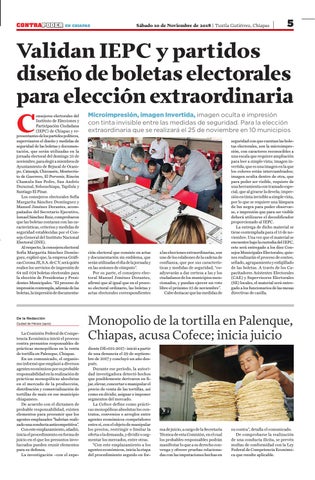 onsejeros electorales del Instituto de Elecciones y Participación Ciudadana (IEPC) de Chiapas y representantes de los partidos políticos, supervisaron el diseño y medidas de seguridad de las boletas y documentación, que serán utilizadas en la jornada electoral del domingo 25 de noviembre, para elegir a miembros de Ayuntamiento de Bejucal de Ocampo, Catazajá, Chicoasén, Montecristo de Guerrero, El Porvenir, Rincón Chamula San Pedro, San Andrés Duraznal, Solosuchiapa, Tapilula y Santiago El Pinar. Los consejeros electorales Sofía Margarita Sánchez Domínguez y Manuel Jiménez Dorantes, acompañados del Secretario Ejecutivo, Ismael Sánchez Ruiz, comprobaron que las boletas contaran con las características, criterios y medidas de seguridad establecidas por el Consejo General del Instituto Nacional Electoral (INE). Al respecto, la consejera electoral Sofía Margarita Sánchez Domínguez, explicó que, la empresa Gráficas Corona JE, S.A. de C.V, será quién realice los servicios de impresión de 64 mil 024 boletas electorales para la elección de Presidentas y Presidentes Municipales. “El proceso de impresión contempla, además de las boletas, la impresión de documenta-