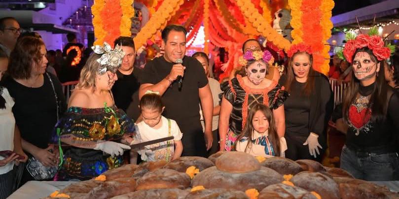 Rodeado de familias y personas de todas las edades, vestidas con trajes y disfraces alusivos al Día de Muertos, el gobernador Eduardo Ramírez Aguilar acompañó a su hija, Yazmín Ramírez Espinoza, en el tradicional corte del pan de muerto, como parte de las actividades del Festival Xibalbalam.