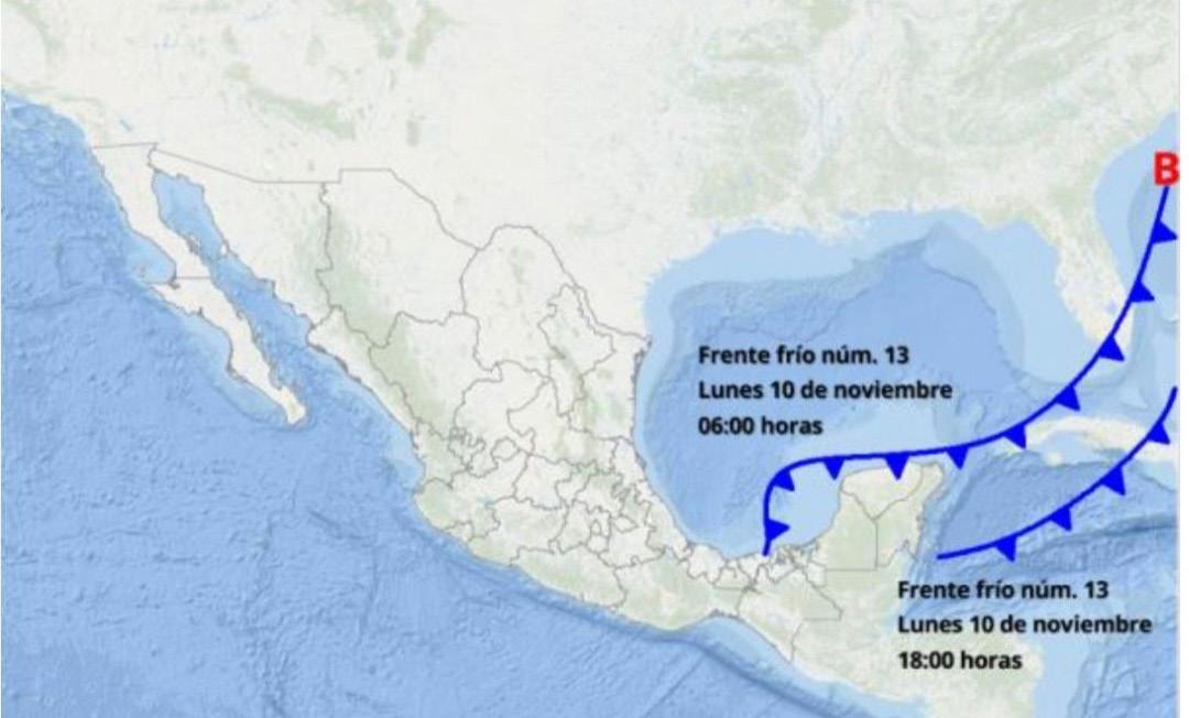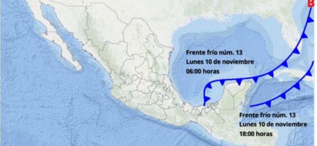 nal del Agua (Conagua) el frente frío No. 13 se desplazará durante el lunes sobre los estados del oriente y sureste del país, así como la Península de Yucatán, a su paso ocasionará lluvias intensas a torrenciales sobre dichas regiones, la masa de aire ártica que lo impulsa ocasionará un evento de “Norte” muy fuerte a intenso y oleaje elevado en las costas de Tamaulipas, Veracruz, Oaxaca y Chiapas.