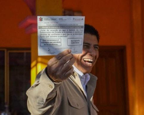 En la elección con forma de plebiscito, que fue ignorada por el 70% de la población, el político solo consiguió el respaldo de 58.8% de los 935 mil oaxaqueños que acudieron a las urnas, e incluso sufrió un severo revés en la capital del estado, donde el 74% de la población votó para que no siguiera al frente del gobierno.