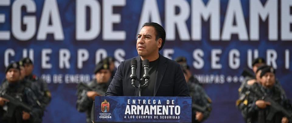 do de la presidenta de México, Claudia Sheinbaum Pardo, así como del secretario de Seguridad y Protección Ciudadana del Gobierno de México, Omar García Harfuch. Reconoció también que el acompañamiento permanente del Ejército Mexicano, la Marina y la Guardia Nacional ha sido fundamental para restablecer la paz en las distintas regiones de la entidad. Por su parte, el secretario de Seguridad del Pueblo, Óscar Alberto Aparicio Avendaño, dio a conocer que, derivado de la voluntad política y el compromiso del gobernador para pacificar Chiapas, se entregarán mil armas de nueva generación a las distintas corporaciones. Detalló que en esta jornada se distribuyeron 500 y que, próximamente, se sumarán otras 500, además de botiquines tácticos de combate. Agregó que este año también se reforzará el equipamiento con cinco unidades Kanan, 15 vehículos