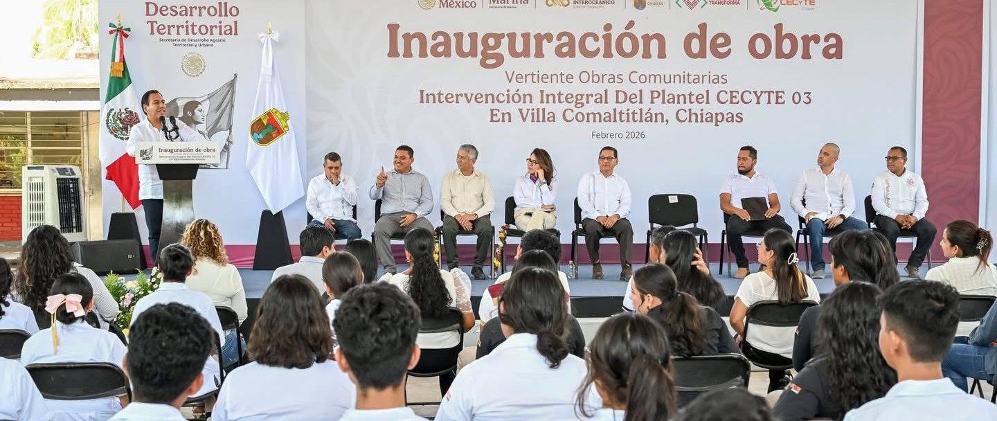 El gobernador Eduardo Ramírez Aguilar, acompañado por la directora general de Obras Comunitarias de la Secretaría de Desarrollo Agrario, Territorial y Urbano (Sedatu), Ana Gabriela Villanueva Huerta, en representación de la secretaria Edna Vega Rangel, y por el vicealmirante retirado, Octavio Sánchez Guillén, director general del Corredor Interoceánico del Istmo de Tehuantepec (CIIT), inauguró obras en los planteles 06 Acapetahua y 03 Villa Comaltitlán del Colegio de Estudios Científicos y Tecnológicos de Chiapas, realizadas mediante la Vertiente Obras Comunitarias, con una inversión cercana a los 10 millones de pesos. En este marco, el mandatario subrayó que el gobierno de la Nueva ERA mantiene una estrecha coordinación con el Gobierno de México para fortalecer la infraestructura estatal y consolidar el desarrollo de Chiapas. Asimismo, agradeció el respaldo de la presidenta Claudia Sheinbaum Pardo a la entidad y reconoció su liderazgo y valentía en la defensa del país, con dignidad y respeto.