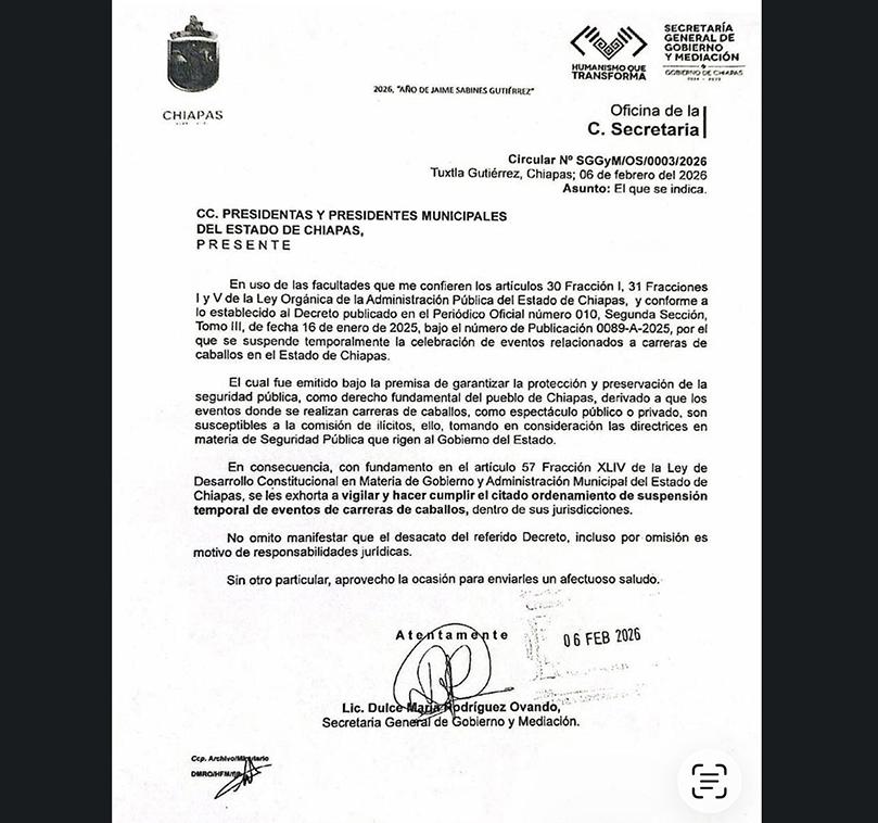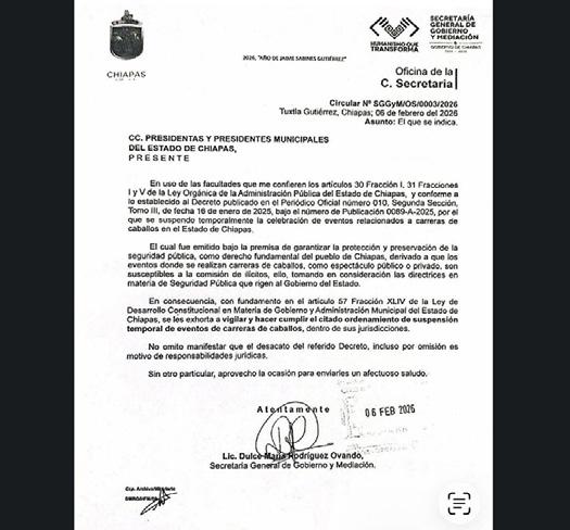 Los 124 ayuntamientos de Chiapas tienen la obligación de vigilar y hacer cumplir la suspensión temporal de carreras de caballos en la entidad, y cualquier omisión o desacato podría derivar en responsabilidades jurídicas para las autoridades municipales, advirtió la Secretaría General de Gobierno y Mediación en un oficio dado a conocer este martes. El documento, firmado por la titular de la dependencia, Dulce María Rodríguez Ovando, fue dirigido a los presidentes municipales para recordarles la vigencia del decreto publicado el 16 de enero de 2025 en el Periódico Oficial del Estado, mediante el cual el gobernador Eduardo Ramírez Aguilar ordenó la suspensión temporal de eventos relacionados con carreras de caballos en todo el territorio estatal .