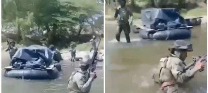 combustible que venía de Guatemala. “No puedes tirar; no puedes tirar”, dice un balsero cuando ve al marino con su fusil acercarse a la balsa. “Aquí estamos grabando”. “Estamos en vivo”, dice mientras uno de los marinos se acerca a la balsa cargada con varios bidones de gasolina para ser comercializada en territorio mexicano.