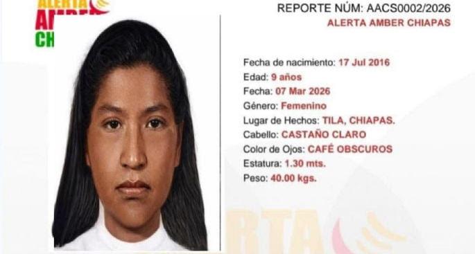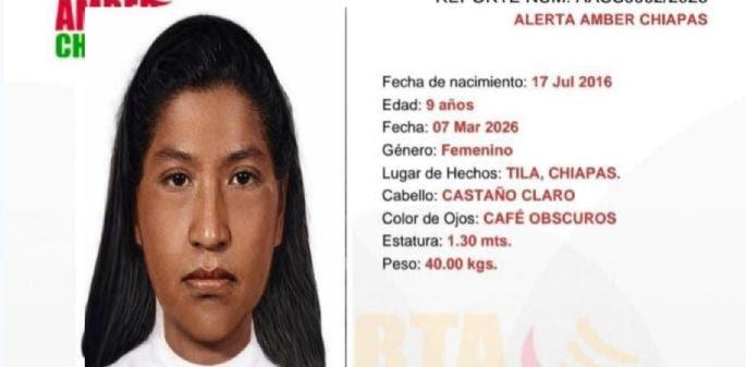camino hacia el municipio vecino de Sabanilla. Debido a la extrema pobreza de la zona, la familia no cuenta con una fotografía de la menor; sin embargo, informaron que el día de su desaparición vestía un pantalón rojo y una blusa verde. Las autoridades elaboraron un retrato hablado y emitieron la Alerta Amber