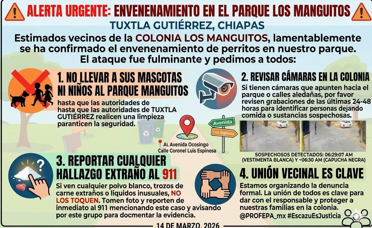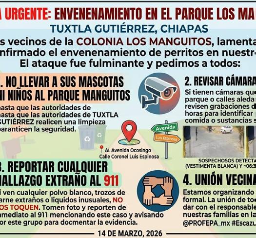 Denuncian envenenamiento masivo de perros y gatos en la colonia Los Manguitos en Tuxtla