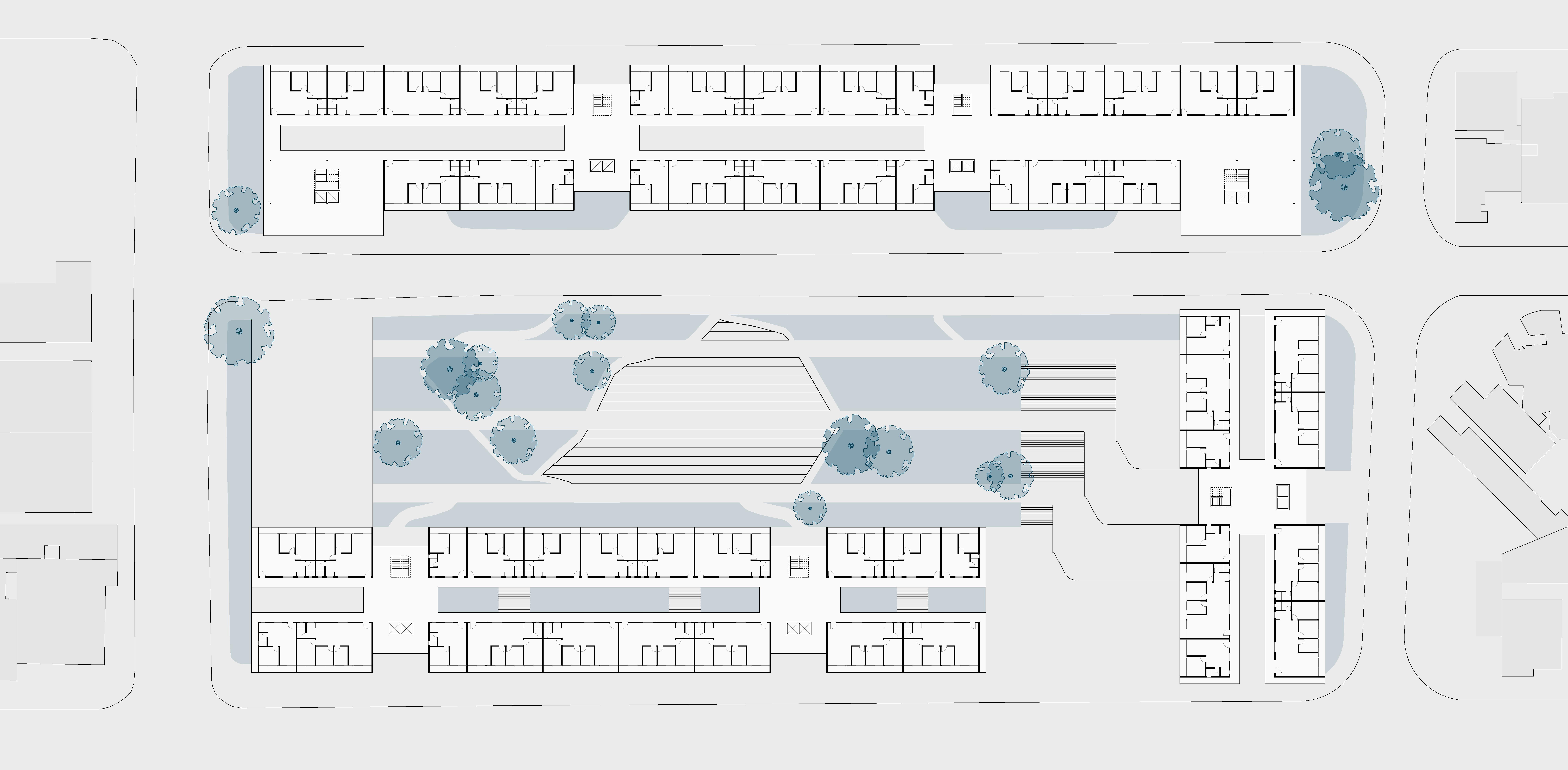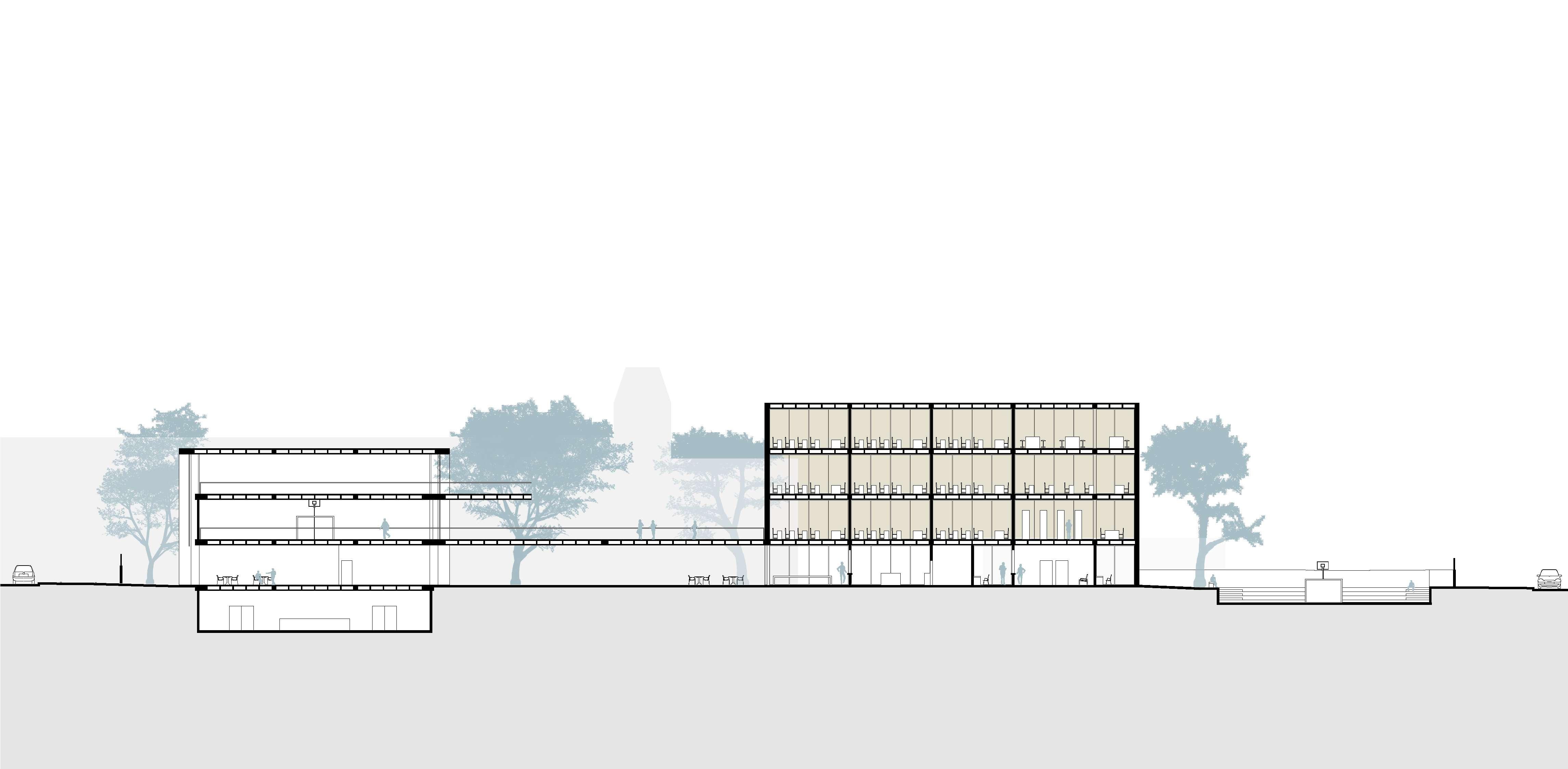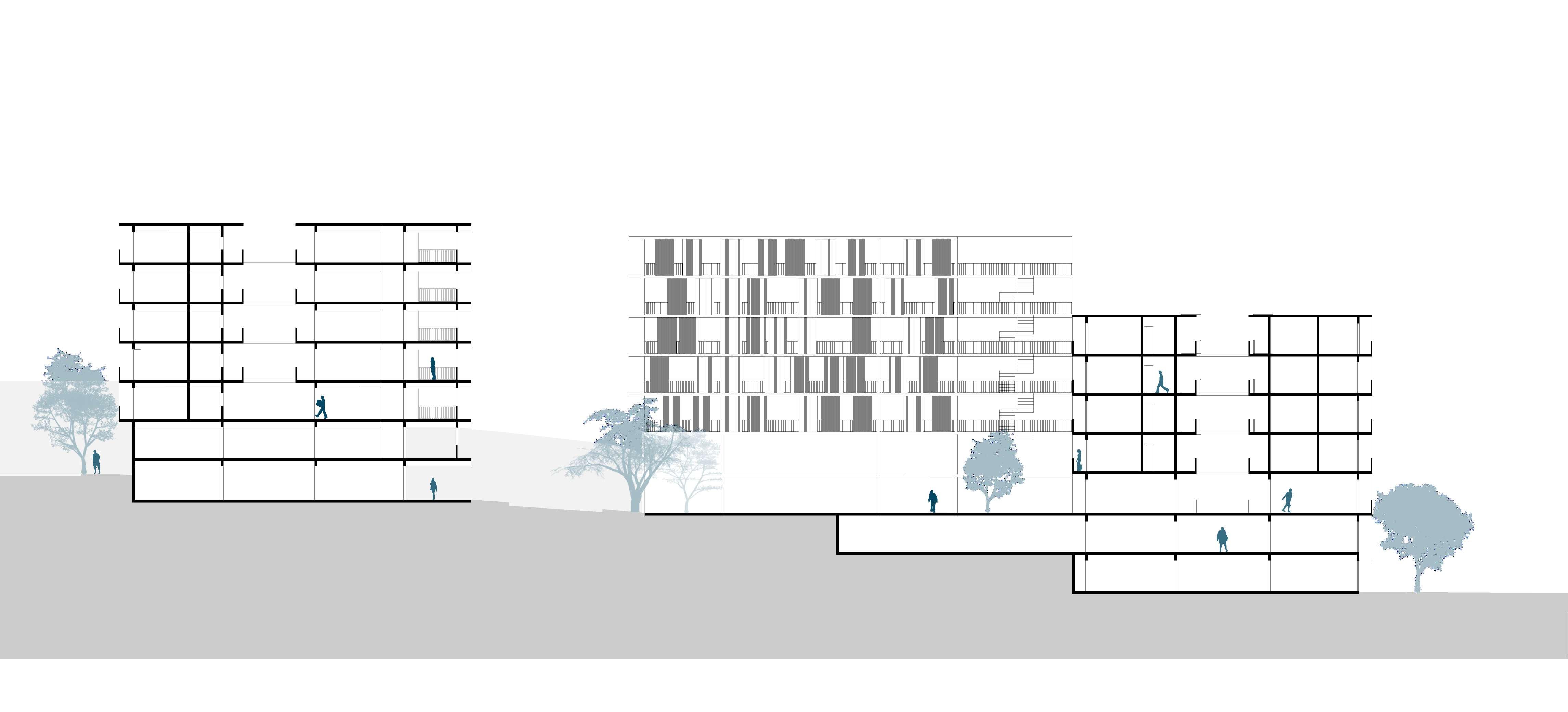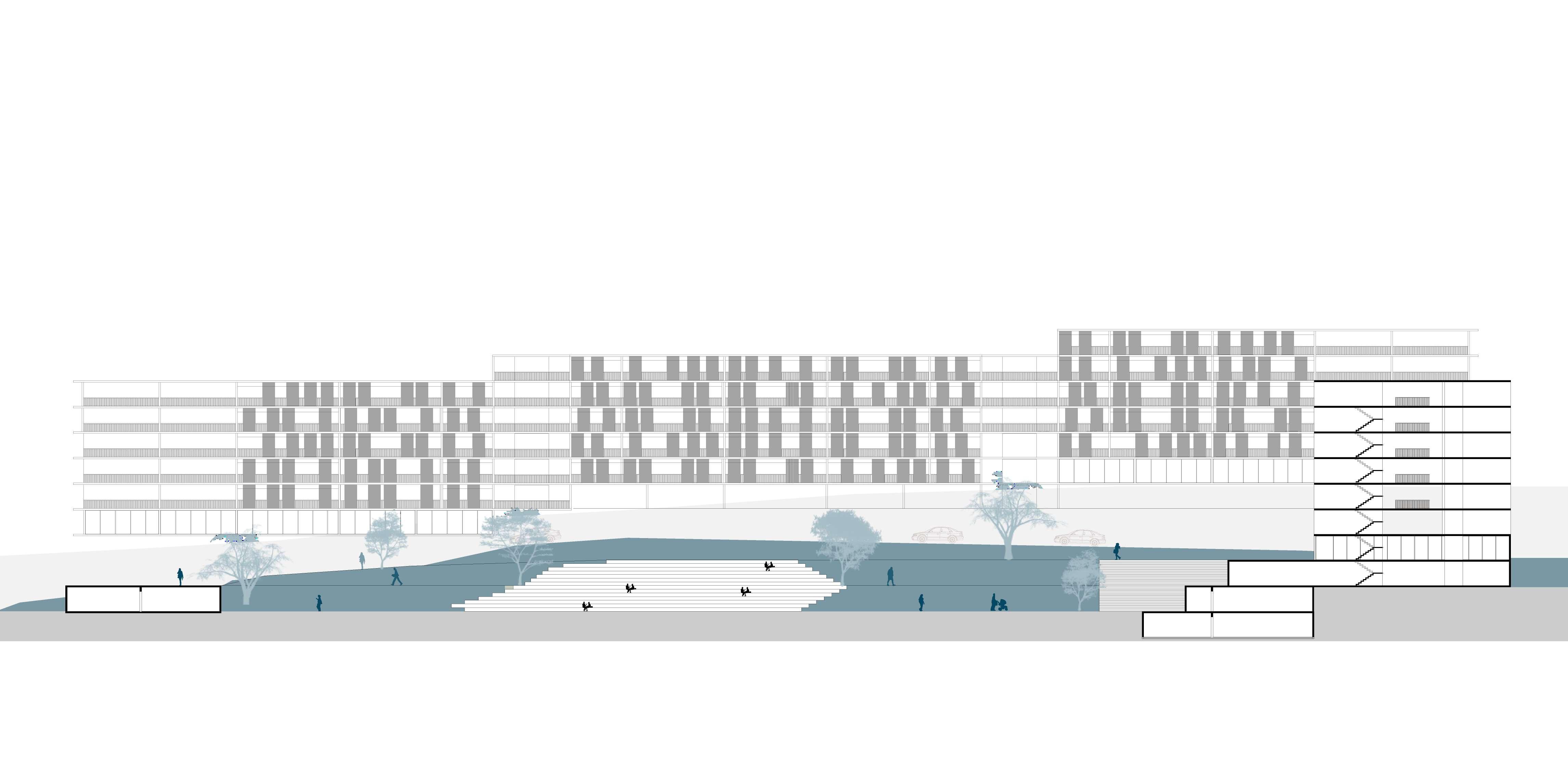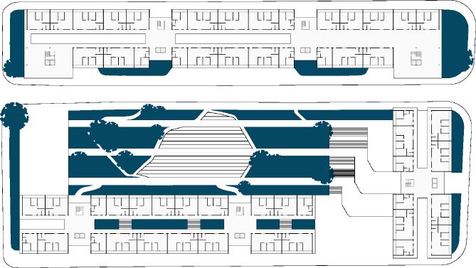 A partir dessa premissa e, entendendo as construções possíveis barreiras sicas no espaço, o projeto habitacional toma como partido essencial a construção de espacialidades ininterruptas no âmbito urbano, estreitando a relação entre indivíduo e cidade. Os vãos livres, como observa-se no corte ao lado, permitem a permeabilidade das quadras e uma constante relação entre diferentes pontos, além do pátio envolvido pelos edi cios habitacionais, observado na implantação, que funciona como uma extensão do Parque Fluvial.