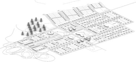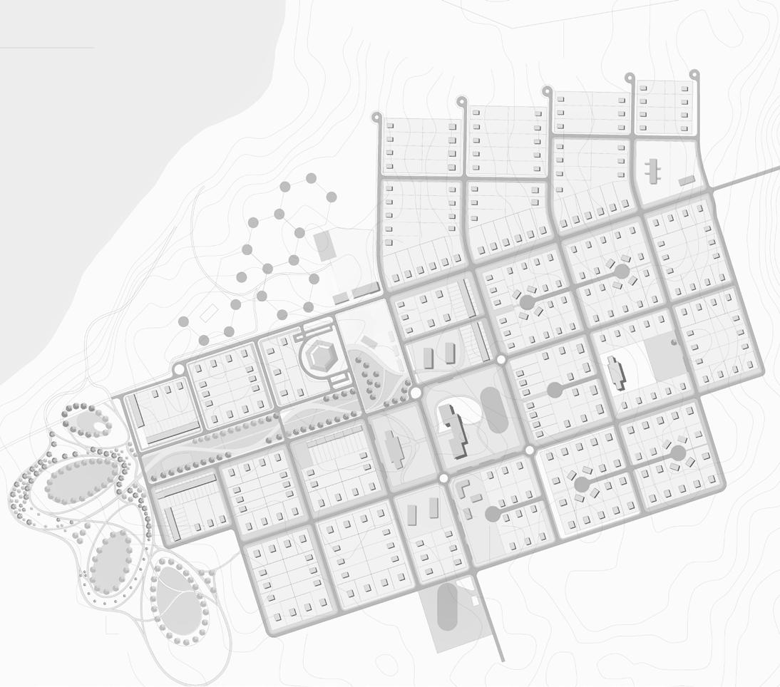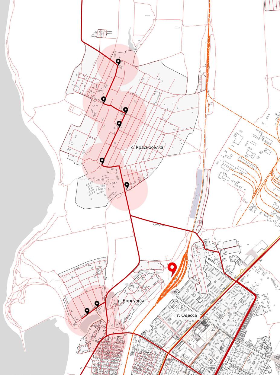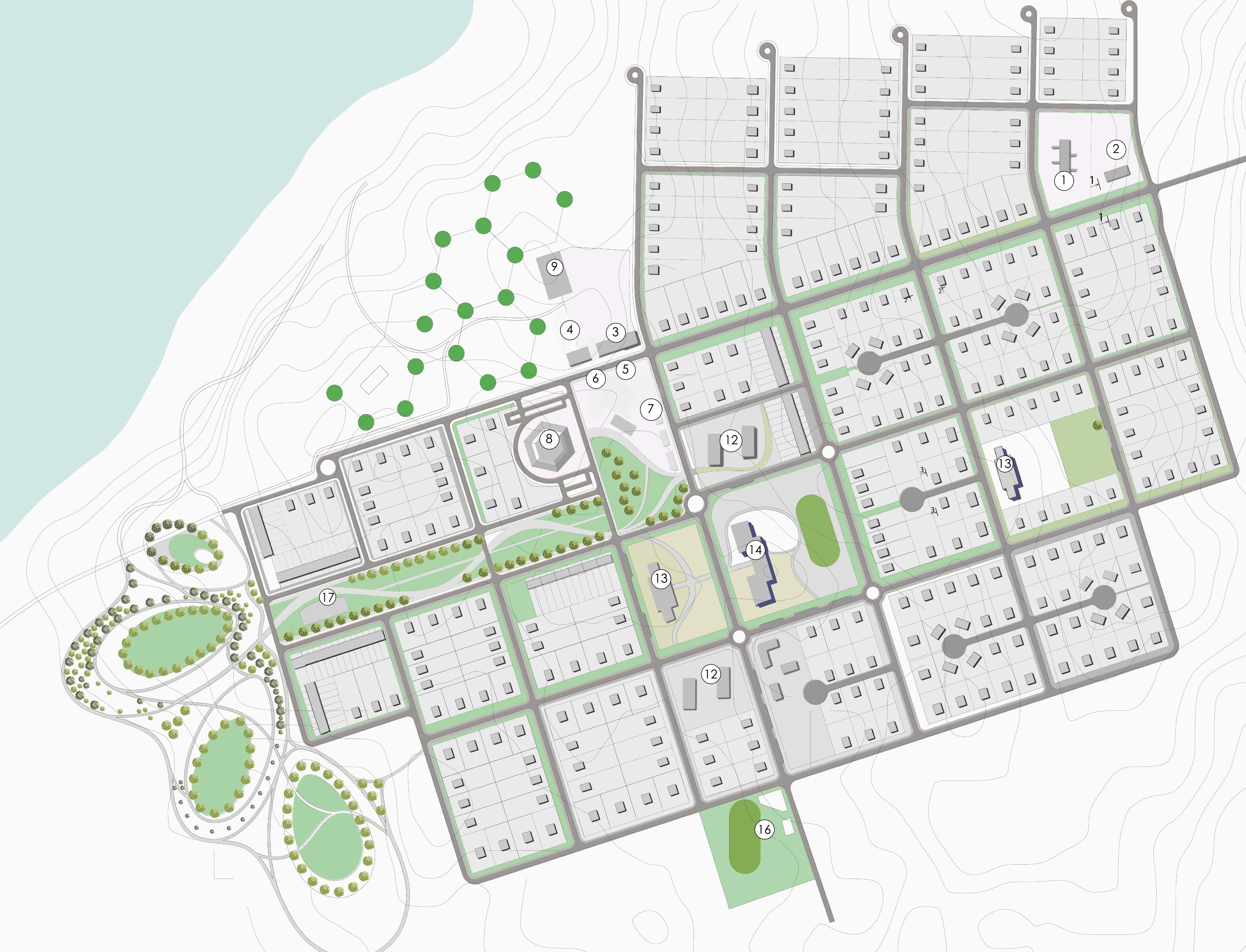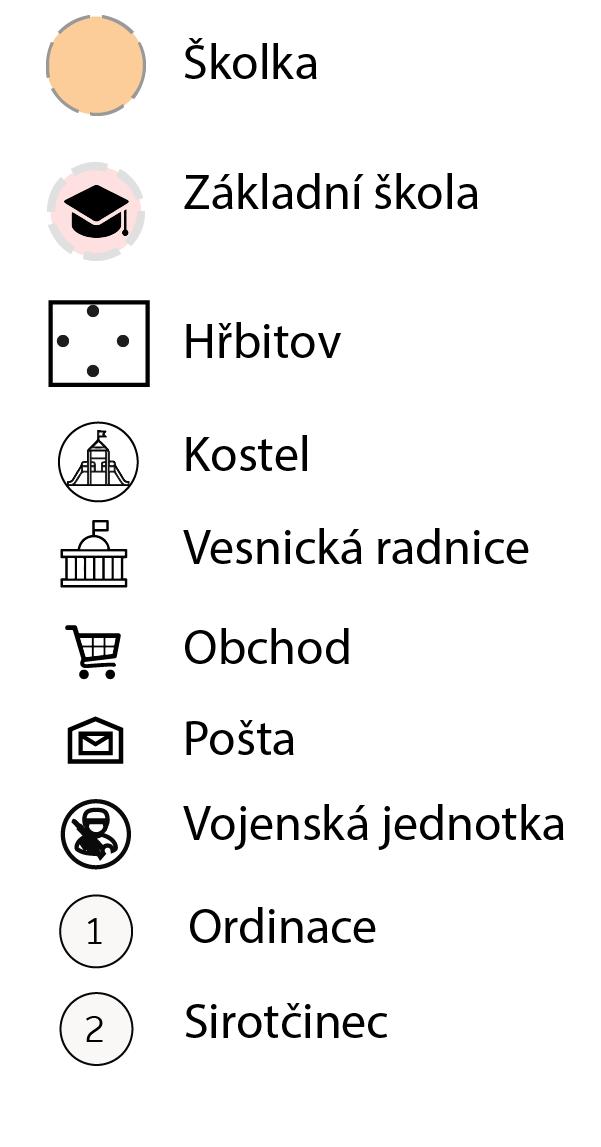 1. autobusové nádraží 2. Hasičská stanice 3. Městská rada 4. Policie 5. Dům kultury 6. Knihovna 7. Stánky na trhu 8. Trh 9. Hotel 10. Restaurace 11. Skleníky 12. Blokový dům 13. Mateřská škola 14. Škola 15. Mateřská škola 16. Sportovní areál 17. Lázeňský dům
