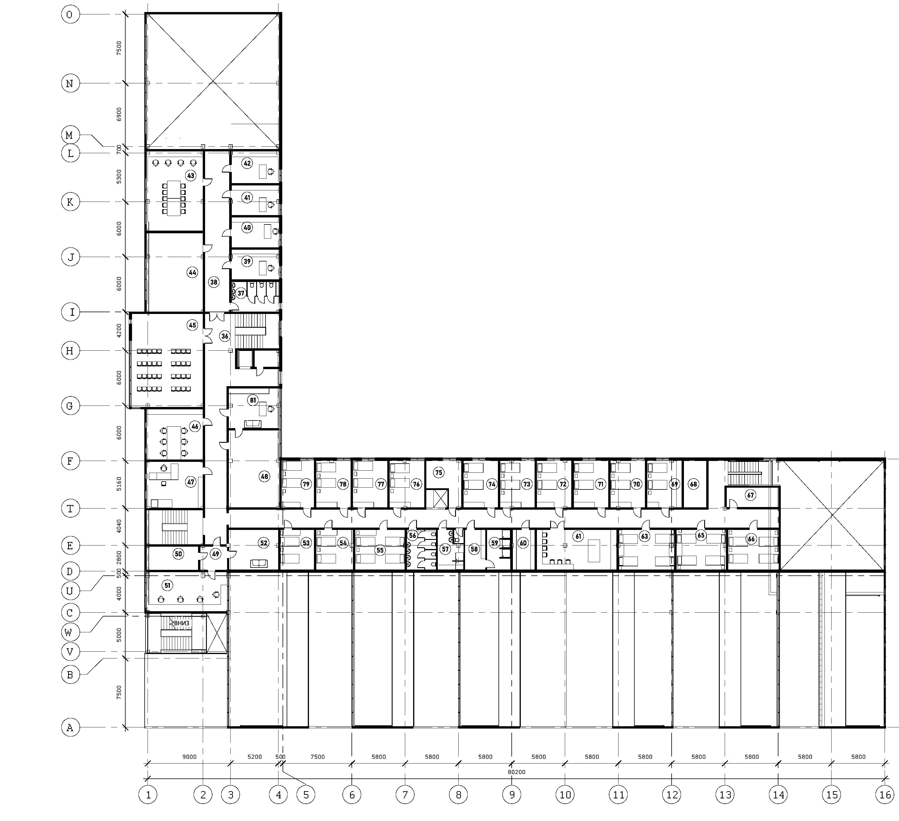 37 Toaleta 38 Pokoj 39 Kancelář úředníka 40 Kancelář 41 Kancelář náčelníka díly 42 Kancelář 43 Zasedací místnost 44 Pokoj 45 Tréninková třída 46 Kancelář 47 Lékařská ordinace 48 Pokoj psychologický vykládání 49 Tambour 50 Hardware 51 Expedice 52 Místnost pro zaměstnance 53 Pokoj 54 Pokoj 55 Pokoj 56 WC 17 m² 47 m² 17 m² 17 m² 17 m² 18 m² 53 m² 53 m² 79 m² 34 m² 31 m² 46 m² 8 m² 15 m² 37 m² 23 m² 16 m² 18 m² 23 m² 57 Sprchový kout 58 Šatna 59 Sprchový kout 60 Prádelna 61 Pokoj 63 Pokoj 81 Ordinace psychologa 14 m² 10 m² 10 m² 11 m² 11 m² 38 m² 26 m²