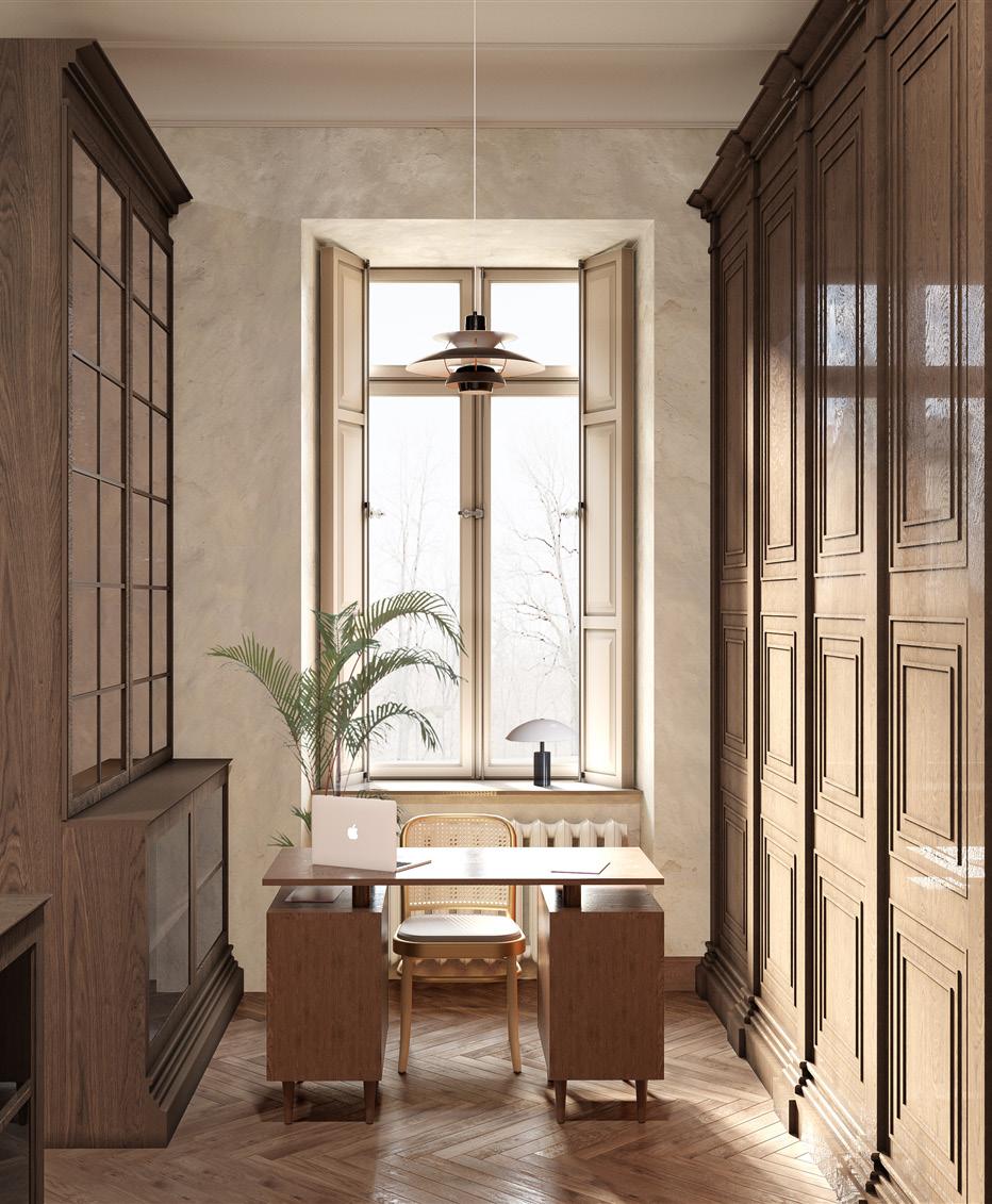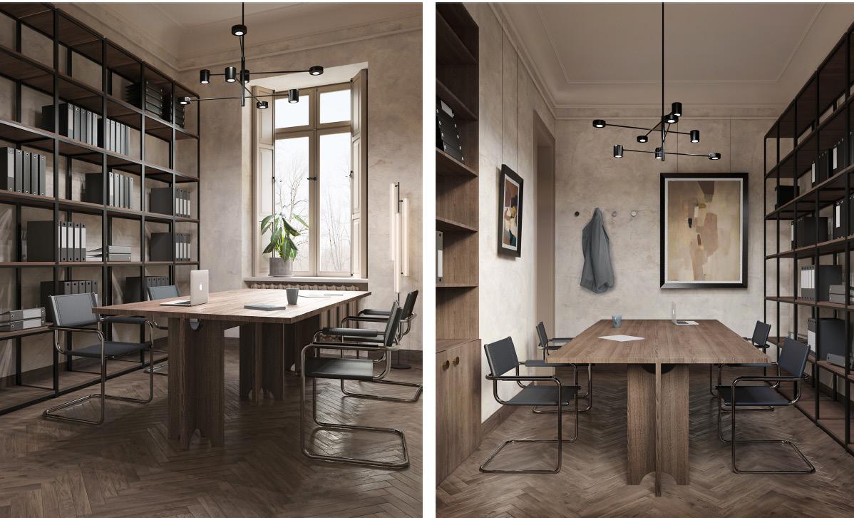 Cíl: renovace a změna designu kanceláře se zachováním starožitného nábytku a návrhem nového.
