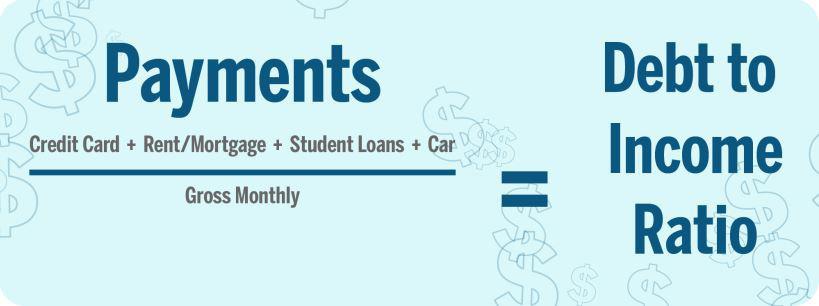 Your debt-to-income ratio, or score, is one of the most impactful numbers on your life since your ACT score. It measures the percentage of your monthly income that goes to pay your debts. You calculate it by adding all your monthly debts – credit card minimums, rent or mortgage, car payments, and, yes, student loan payments. Then, you divide the total by your monthly gross income (takehome pay before taxes and other monthly deductions).