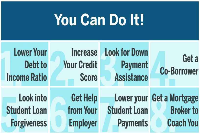Look for someone who is experienced at working with borrowers who have more student debt than they’d like. Get a broker who will work with you to find DPA programs; steer you through the ins and outs of FHA, conventional, and VA loans; and help you get your finances in order so you become a better mortgage candidate. Iorg says his office has a credit analyst whose job is to help clients improve their credit scores and debt-toincome ratios.