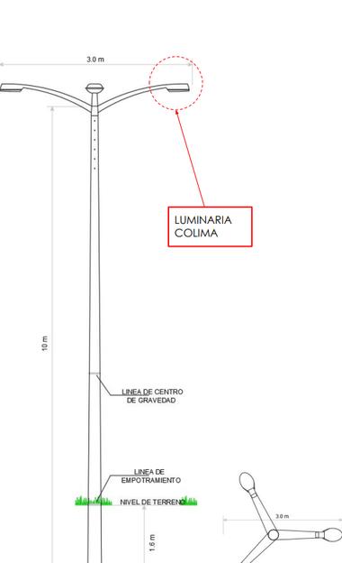 Fuente: Elaboración propia TRIBUNA DE CONCRETO POSTE DE LUZ DOBLE POSTE DE LUZ TRIPLE 8 M 1.5M 9 M 1 6 M DÁMETROBASE 30CM NIVELDEL TERRENO 1 6 M 1 6 M LUMNARIA 1 0 M