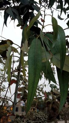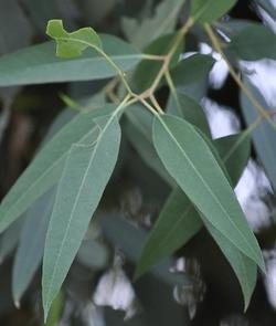 us hojas son dimorfas, con fuerte olor a cineol; son opuestas en las ramas jóvenes y luego son alternas y pecioladas; de color verde; de 10 a 20 cm de largo