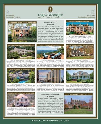 201 DEVON ROAD • $1,450,000 This storybook, 4 bed, 4.5 bath brick home w/ slate roof is sited beautifully on 1 of Ednam Forest’s best parcels, complete w/ circular drive. Vaulted 1st flr master, 2 fireplaces, 2-car garage, lovely & classic finishes throughout. Expansive, bluestone rear terrace, generous front & rear lawns dotted w/ mature hardwoods. Loring Woodriff (434) 466-2992