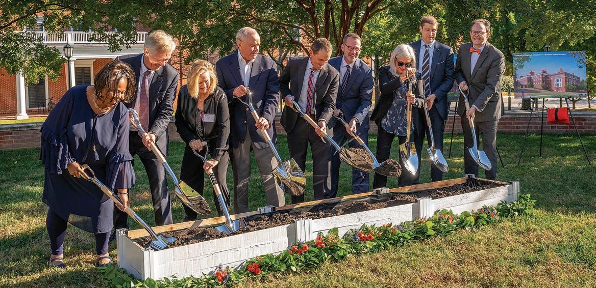 UVA and Darden officials take part in the ceremonial groundbreaking for the new student housing. From left: Vice Dean Melissa Thomas-Hunt, Dean Scott Beardsley, Kathy LaCross, David LaCross (MBA ’78), UVA President Jim Ryan, former Provost Ian Baucom, Architect for the University Alice Raucher, Darden School Foundation Board Chair Frank M. Sands (MBA ’94), and Senior Associate Dean Marc Johnson (EMBA ’13).