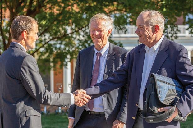 UVA President Jim Ryan shakes hands with David LaCross (MBA ’78) alongside Darden Dean Scott Beardsley.