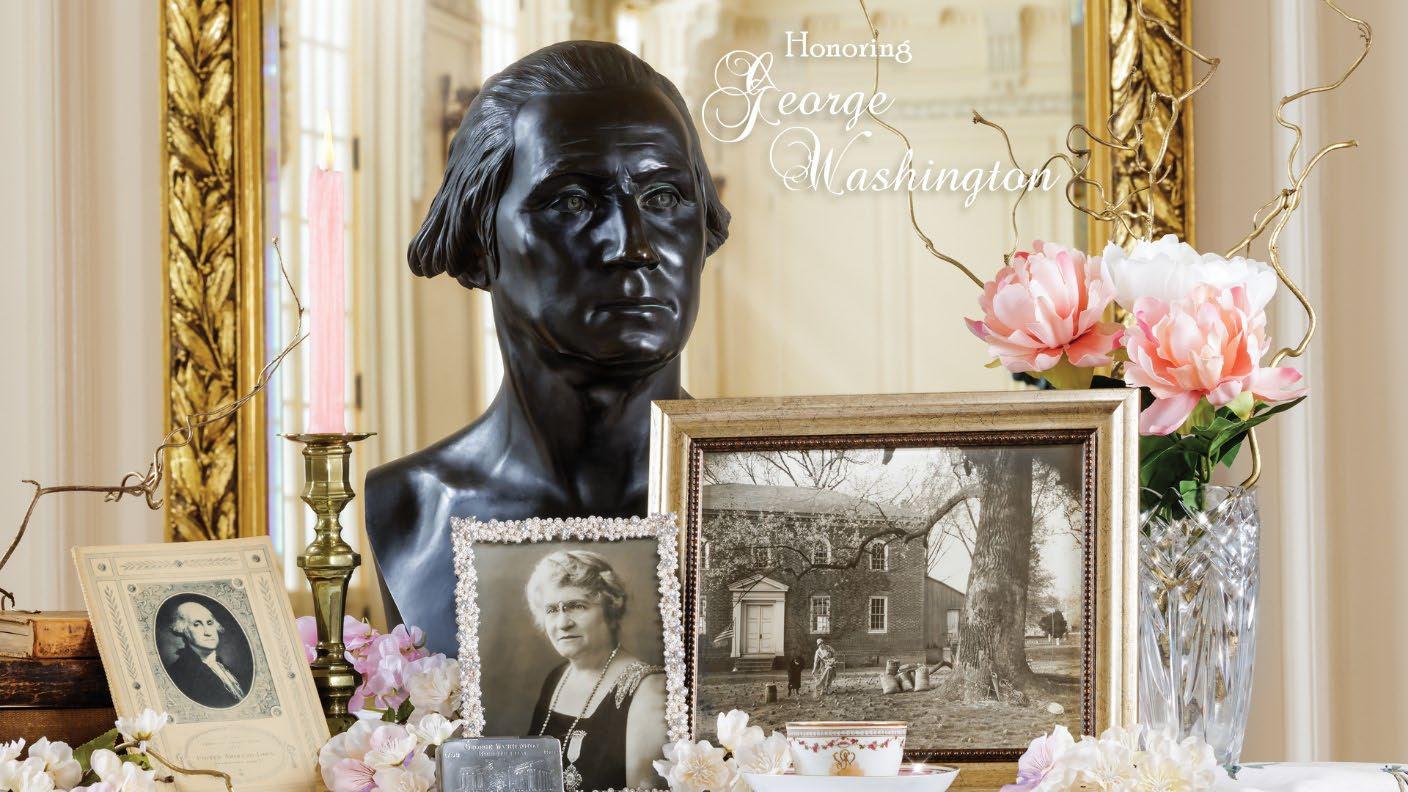 Conservation efforts for the Washington Bicentennial included preservation of the Washington Tulip tree at Falls Church, Virginia. The tree is pictured with President General Edith Irwin Hobart. The tableau also features a rare 1782 tea bowl gifted to George Washington and his bronze bust. Leaning against Mrs. Hobart’s portrait is a reproduction of a colonial snuff box commemorating the Bicentennial.