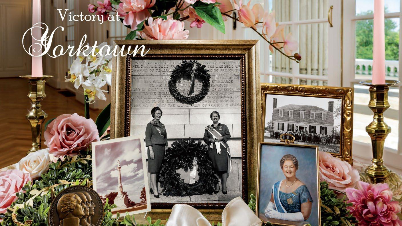 A photograph of President General Marion M. Duncan with Virginia State Regent Margaret C. Smith at the Victory Monument lays in tribute with other Yorktown items such as a photo of Honorary President General Florence Becker with DAR members at Moore House, where Cornwallis surrendered, and a bronze medal of Washington, De Grasse Tilly, and Rochambeau, commemorating the 150th anniversary of the surrender at Yorktown in 1931.