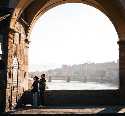 Cada imagen captura un momento efímero: un viajero fotografiando el horizonte, dos figuras inclinadas sobre la pared observando el agua y una pareja absortaenelpaisaje.