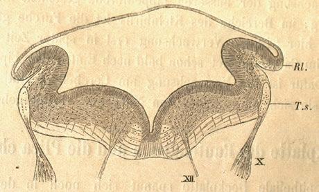 Fig. 1 The rhombic lip of a human embryo at the level of the greatest width of the fourth ventricle (Reproduced from His (1888) [1]). Abbreviation: R.l. rhombic lip, Ts. solitary tract, X, XII vagal and hypoglossal nerves