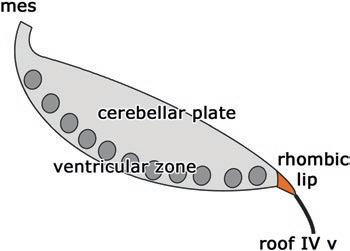Fig. 3 Diagram of a sagittal section, showing the division of the germinal zone of the early cerebellar plate into the ventricular zone that will give rise to inhibitory neurons and the upper rhombic lip that produces the excitatory neurons of the cerebellum. (Redrawn from Golgowitz and Hamre (1998) [124])
