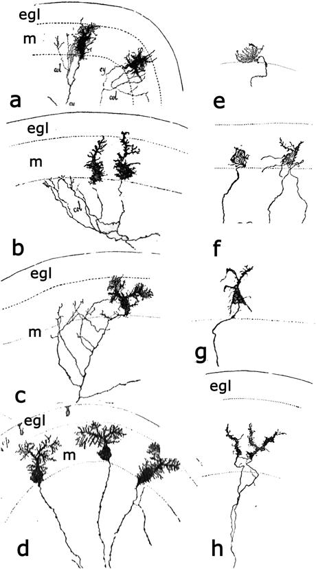 In his Golgi studies, Cajal (1890a, b, 1909–1911) and his followers (Athias 1897; Lugaro 1894; Popoff 1897) distinguished different phases in the development of the Purkinje cells (Fig. 6a–d) [23–28]. In the frst phase of the “disoriented
