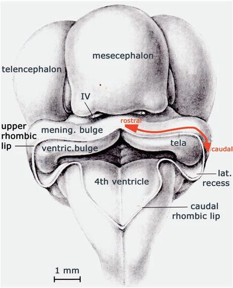 The study of cerebellar embryology begins with His’ (1888, 1891) description of his Rautenlippe (rhombic lip) in a human embryo. In the ffth week, the “dorsal rim (of the rhombencephalic alar plate) curves laterally and forms a fold which surrounds the entire rhombic cavity …” (Fig. 1) [1, 2]. His divided the rhombencephalon and its rhombic lip into rostral and caudal portions. The rostral (upper) rhombic lip will give rise to the cerebellum, the caudal (lower) rhombic lip to several precerebellar nuclei. The upper rhombic lip develops in two bilateral swellings connected