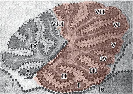The general opinion was that the cerebellum originates from the dorsal portion of the frst rhombomere [3, 4]. Several papers used the quail-chick marker system to trace the origin of the cerebellum. Substitution of the mesencephalic vesicle in chickens with a quail transplant resulted in the replacement of Purkinje cells and ependyma in the rostral cerebellum by cells with the typical massed quail chromatin in their nucleoli. According to Martinez and Alvarado-Mallart (1989), these cells are present in a broad medial stripe, where labeled and non-labeled Purkinje cells occur together [5]. Labeling is also found of the granule cells. According to Hallonet et al. (1990), the labeled Purkinje cells are found in a V-shaped, rostral region reaching caudally to lobule VIII (Fig. 4) [6]. These authors denied the labeling of granule cells and concluded that these cells originate exclusively from the metencephalon, confrming the general opinion on this matter. Martinez and Alvarado-Mallart suggested that the rostral cerebellum might originate from the isthmic rhombomere, whereas its middle portion is a derivative of the frst rhombomere. Its caudal portion, including the auricle and part of the avian lateral cerebellar nucleus, is derived from the second rhombomere [7]. Sgaier et al. (2005) and Nieuwenhuys and Puelles (2016) pointed out that the cerebellar anlage rotates from an original rostrocaudal to a mediolateral position, due to the development of the pontine fexure (Fig. 2) [8, 9]. Purkinje cells produced by the ventricular zone maintain their mediolateral position in the adult cerebellum. Those produced by the most medial (presumably isthmic rhombomere-derived) ventricular zone become located in the future vermis, subsequently more lateral parts of the ventricular zone give rise to Purkinje cells of more lateral parts of the hemisphere [10]. Granule cells produced by the upper rhombic lip do not maintain their original mediolateral position in the adult, due to their lateromedial tangential migration in the external granular layer (EGL).