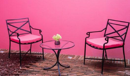 Entre las características más destacadas se encuentran sus amplios patios interiores, jardines exuberantes y corredores con arcos de medio punto. Cuyo color predominante es el rosa mexicano con acentos en color blanco y la aplicación de madera en tonos maple para el mobiliario, puertas y ventanales, todos en perfecta armonía con macetones de barro crudo donde se incorporan cactáceas y agave, los cuales también son elementos tradicionales de la zona. Por su parte el piso de los patios lo encontraremos con grava y tezontle suelto, así como baldosas de barro, que se fusionan en armonía con unos caminos hechos con tablas de madera robusta que te conducen a las habitaciones.
