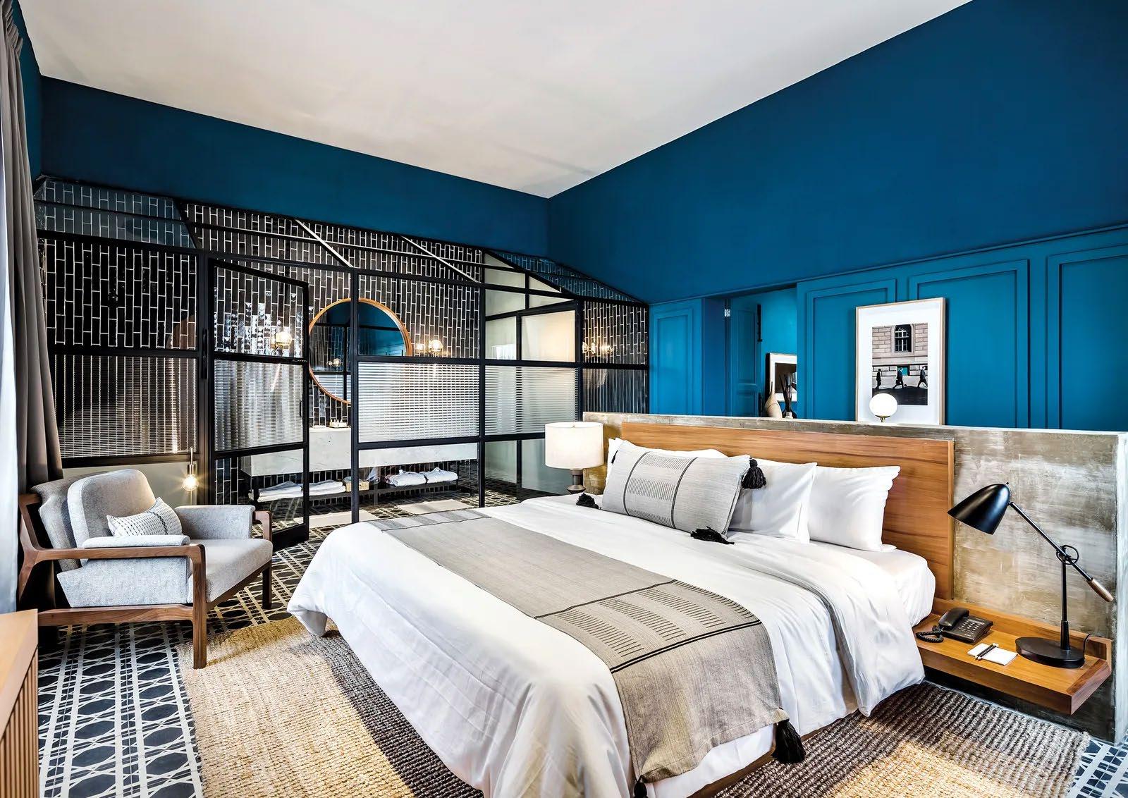Una vez que ingresas a éstas, podemos notar que se acortaron los techos altos que antes tenían vigas de madera expuestas, para dar paso a plafones sobre los cuales se dejaron expuestas tuberías negras de estilo industrial, que le brinda un toque atrevido de modernidad. Los grandes ventanales permiten la entrada de luz natural, creando un ambiente cálido y acogedor, donde nuevamente encontramos elementos decorativos como textiles que incluyen el color rosa mexicano y el blanco, principalmente en las almohadas y los cojines, así como lámparas tejidas colgando de los techos que combinan a la perfección, haciendo juego con los tapetes también de textiles típicos de la región, en colores neutros donde prevalecen los grises. Por su parte las cabeceras son de madera, también en color maple, que combinan perfectamente con los tonos neutros en las paredes (un tono aparentemente amate).