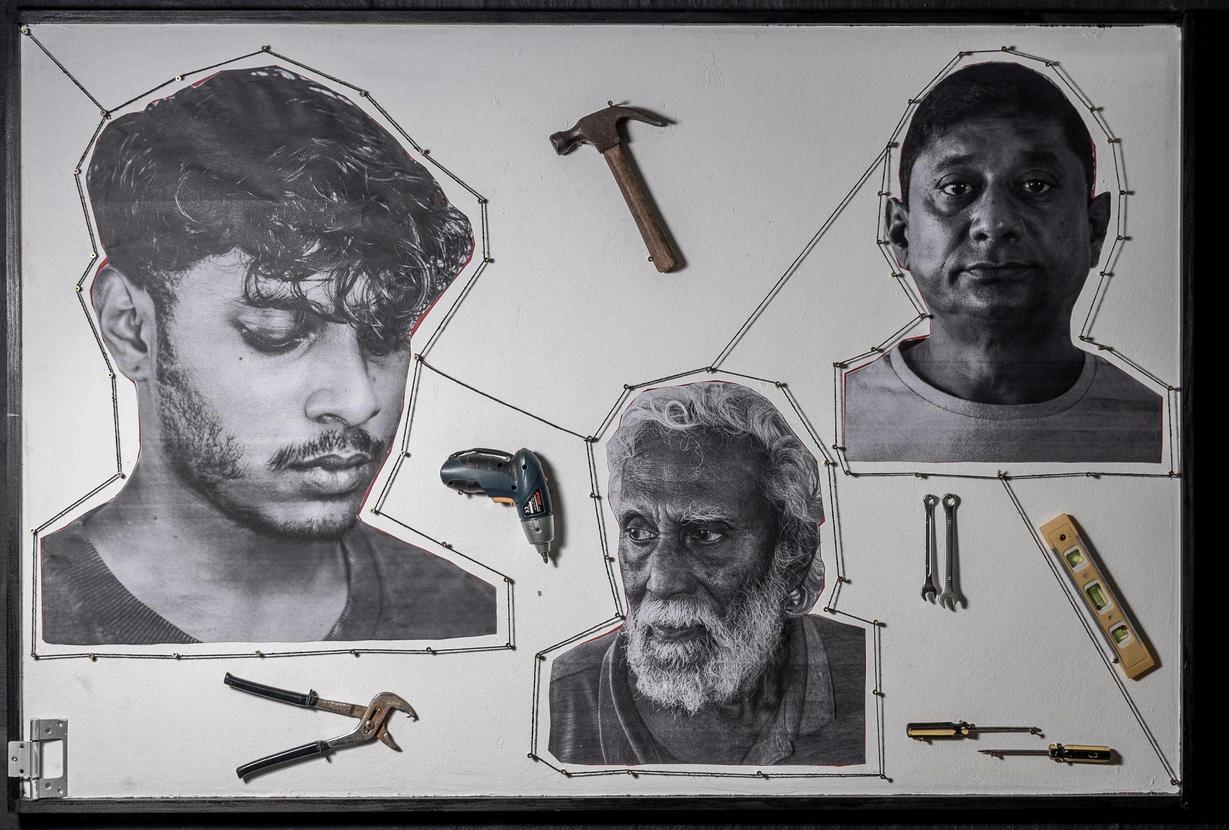 Fig19.DariusNaidoo.ToolsandTethers.2024,photographedbyNiamhWalsh-Vorster. PhotographicCollagewithFoundObjects,103.3cmx153.3cm