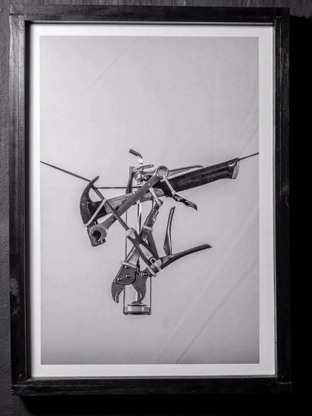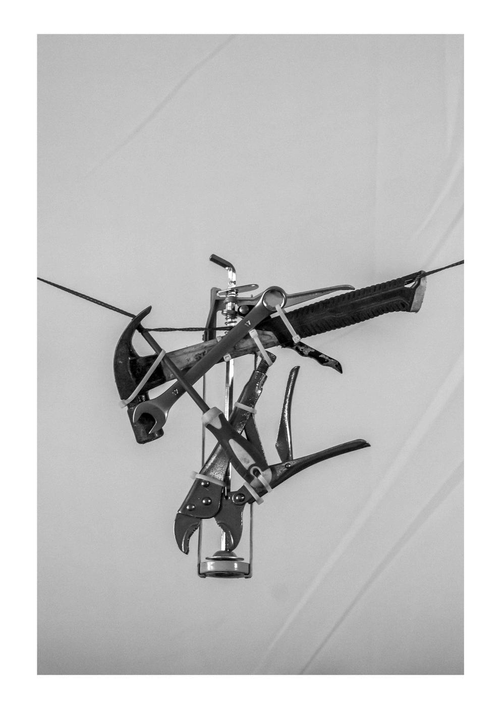 Thesevisualmethodsarenotableinmyphotographicwork, RelicsofMyMasculinityII(2024)(Fig15).Inthisartwork,I createameticulouscompositionusingtoolsandtethered elements.Thisartworkusescabletiestocombinetools,such asahammer,wrench,andspanner.Indoingso,Istripeach toolofitsutilitarianfunction,makingthehybridizedtoolfeel awkwardandcumbersome.Tetheredtofixedpoints,the hybridizedtoolhangssuspensefullyintheair,symbolizingthe inheritedmasculineidealsIcannotgraspentirely.Justasthe toolbecomesuseless,sotoodoestheinheritedmodelof masculinitypasseddowntomefrommyfatherand grandfather.