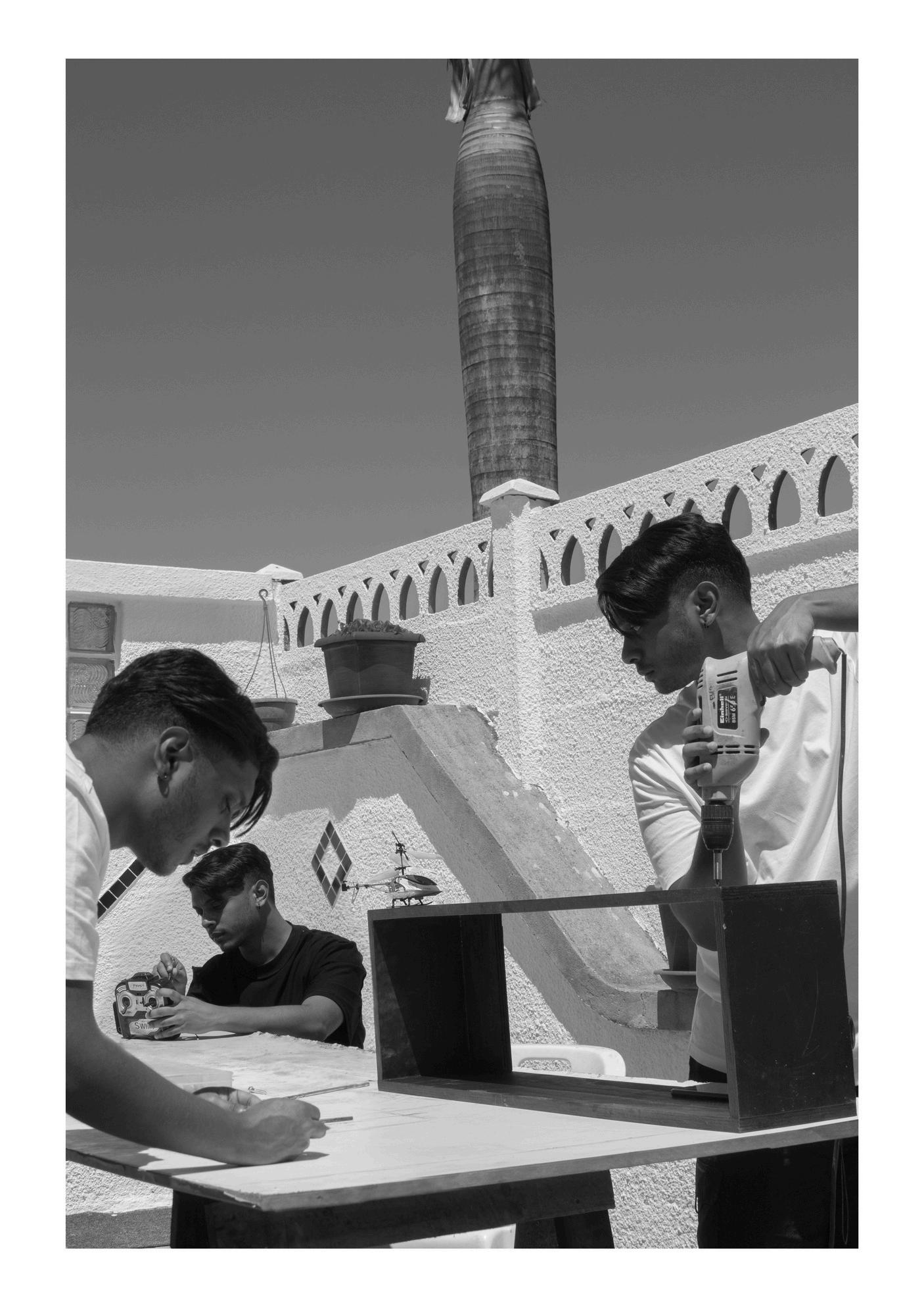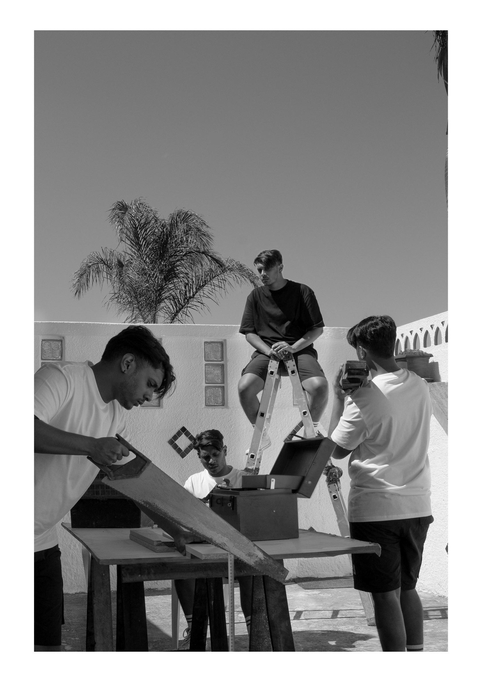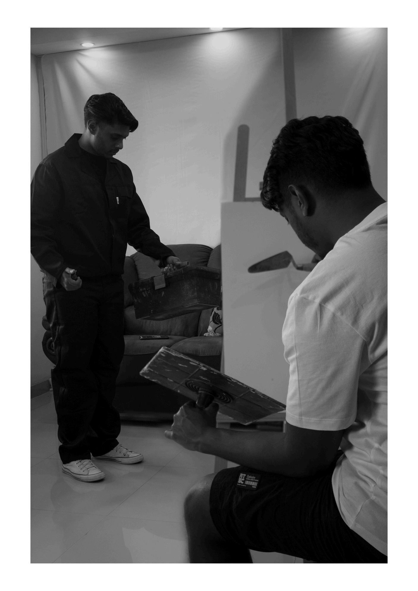 TornBetweenTasks(2024)(Fig14)isafive-set photographicseries.InspiredbyConnell'swork,I constructedphotographsthatechomypast interactionswithmyfatherandgrandfather.Given thecamera'sinherentqualityofdocumenting momentsintime,thesephotographscreateavisual dialoguethatjourneysthroughmylivedexperiences asayoungmangrowingupinahouseholdthat valuedtheabilitytoperformmanuallabor.By duplicatingmyselfusingthedoubleroletechnique, thedualitywithinmyselfishighlighted,reiterating themesofconformityandintroducingthemesof rebellion.IamtornbetweenwhatIwanttodoand whatmyfatherexpects.Ultimately,mydisconnection withmanuallaborpaintsapictureofa"blacksheep identity,"alienatingmyselfasIdon'tnaturallyalign withmyfather'smasculinity.Araünaetal.(2018:85) mention,"Masculinityisbothapersonalfeatureand amanifestationofsocialstructure."TornBetween Tasks(2024)considersthisinterplaybetweenmy personalinterestsandexpectationsimbuedinme throughsocializationandintergenerational reproduction.